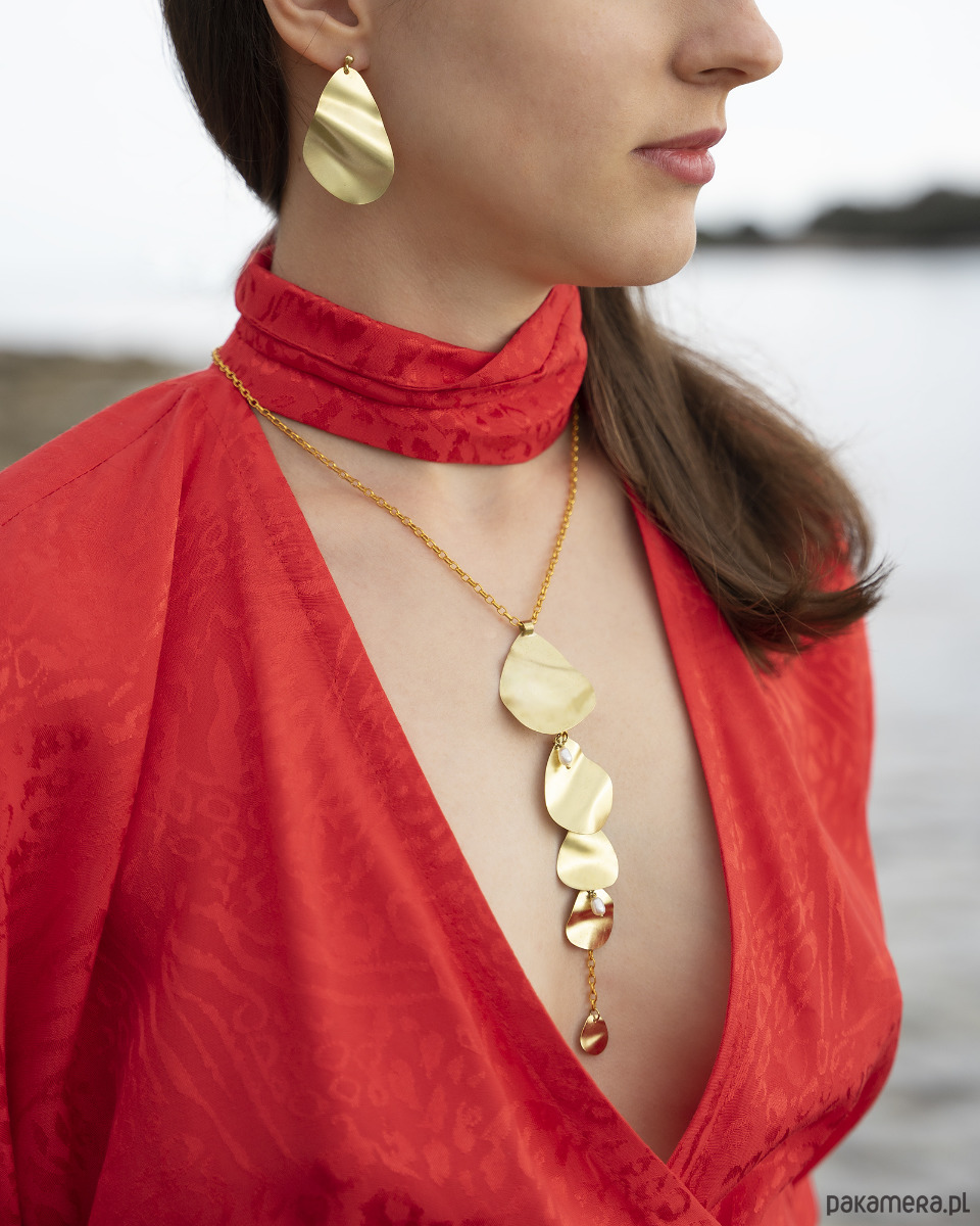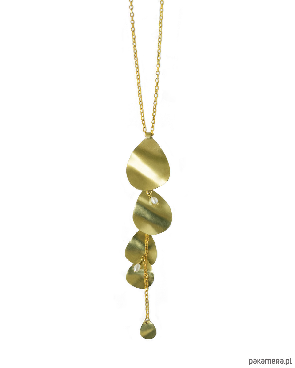 Naszyjnik składa się z pojedynczego łańcuszka ozdobionego mosiężnymi płatkami i perłami hodowanymi. Jego długość sprawia, że idealnie komponuje się z koszulami lub sukienkami z głębokim dekoltem. Idealny wybór dla kobiet, które cenią prostotę i elegancję.