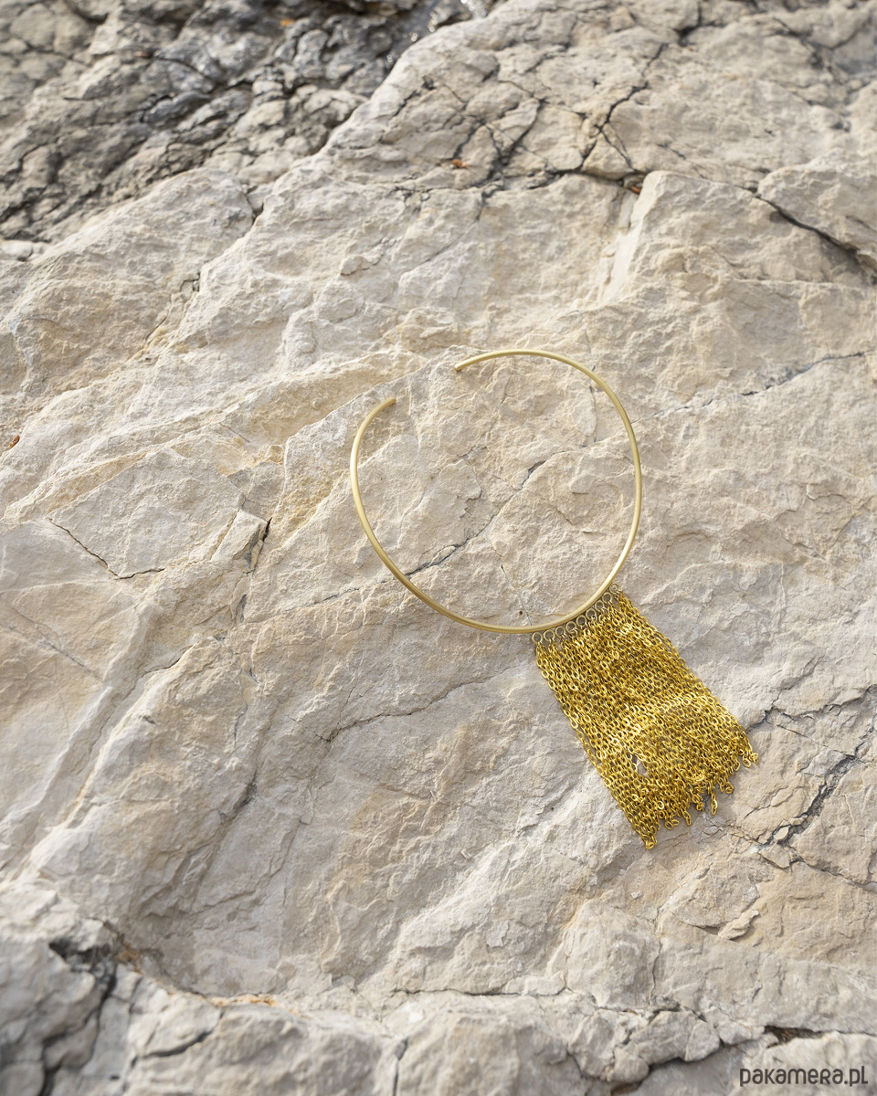 Sztywna kolia z frędzlami emanuje czystą elegancją. Forma koła kontrastuje z delikatnymi łańcuszkami tworzącymi zwiewną, pobłyskującą w ruchu kompozycję.