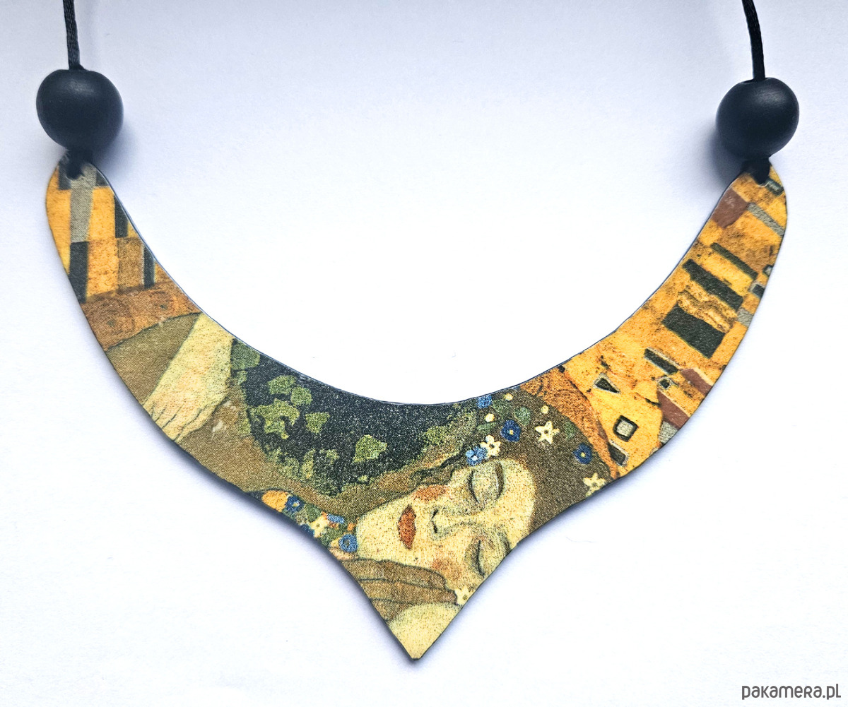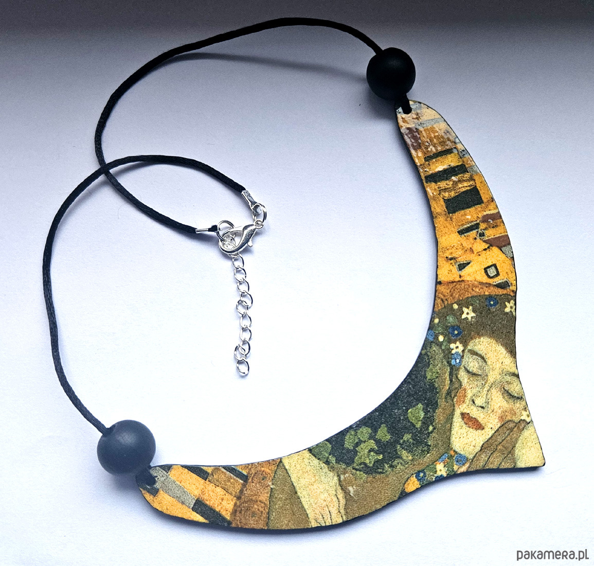 drewniany naszyjnik ozdobiony metodą decoupage, jednostronny, starannie wykończony farbami akrylowymi i zabezpieczony wielokrotnie lakierem, korale drewniane, elementy posrebrzane, szerokość: 15 cm, bardzo lekki