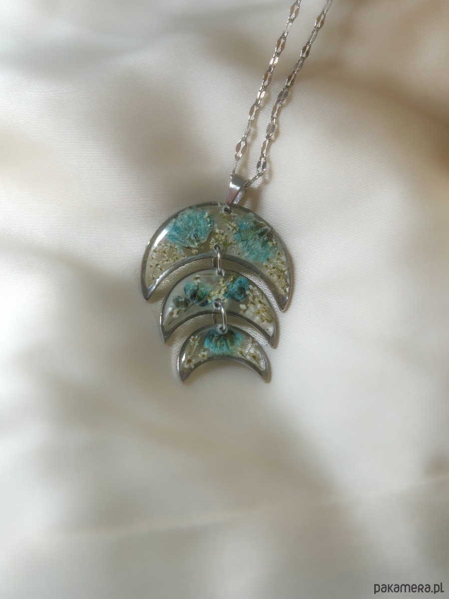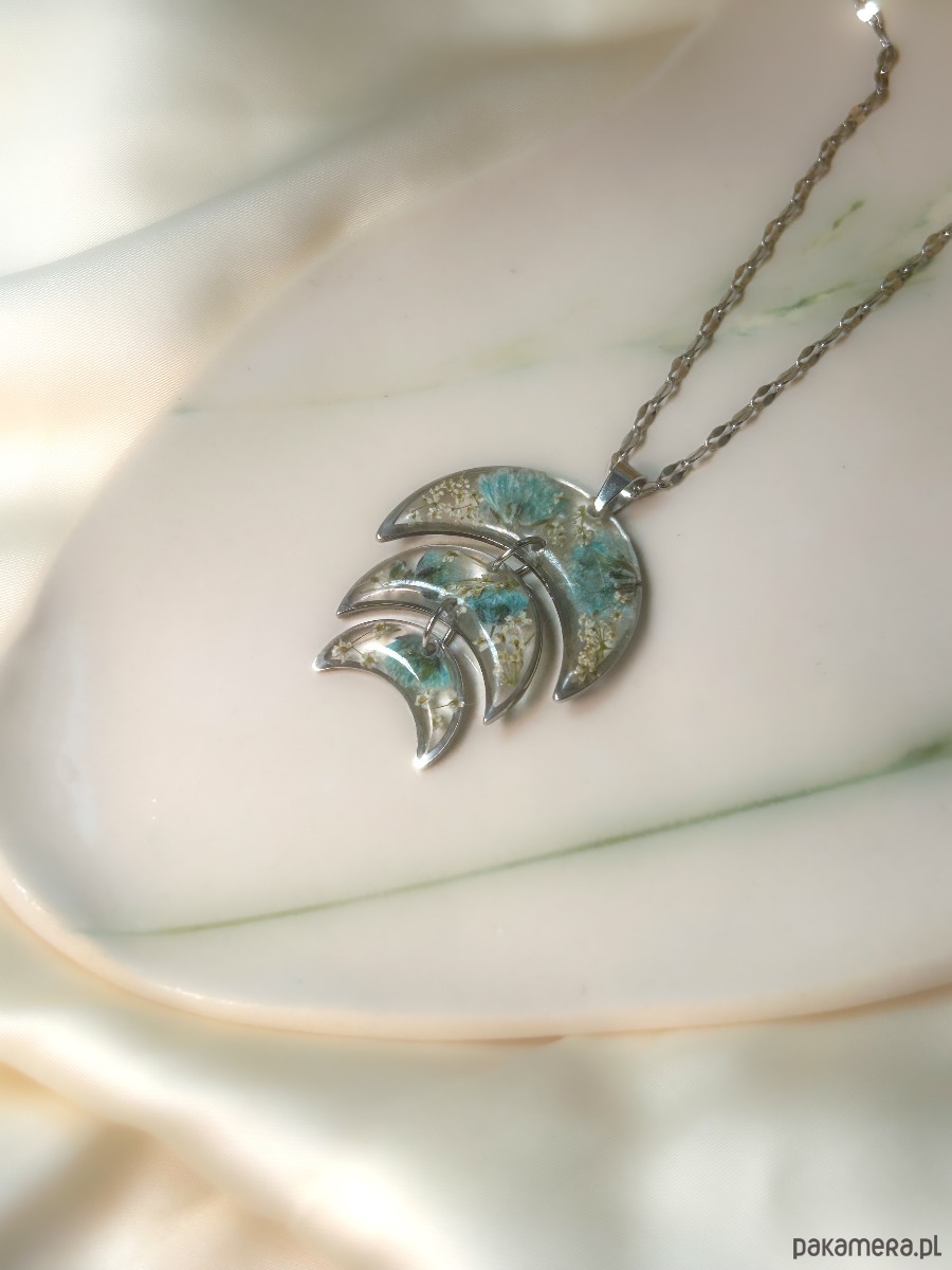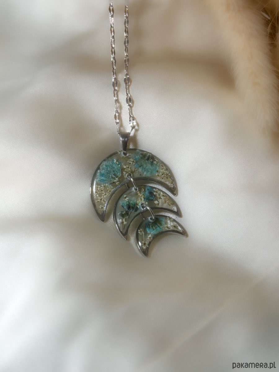 Ten naszyjnik to subtelne połączenie natury i symboliki księżyca — pełen delikatności, kobiecej energii i ukrytej mocy. W trzech srebrzystych półksiężycach zatopiłam maleńkie kwiaty gipsówki i dzikiej marchwi – roślin, które od wieków symbolizują czystość, ochronę i wewnętrzną harmonię.