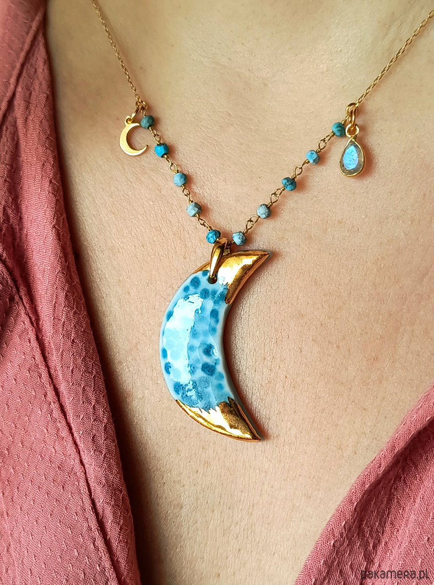 Łańcuszek ozdobiony jest księżycem, labradorytem oraz drobnymi turkusami.