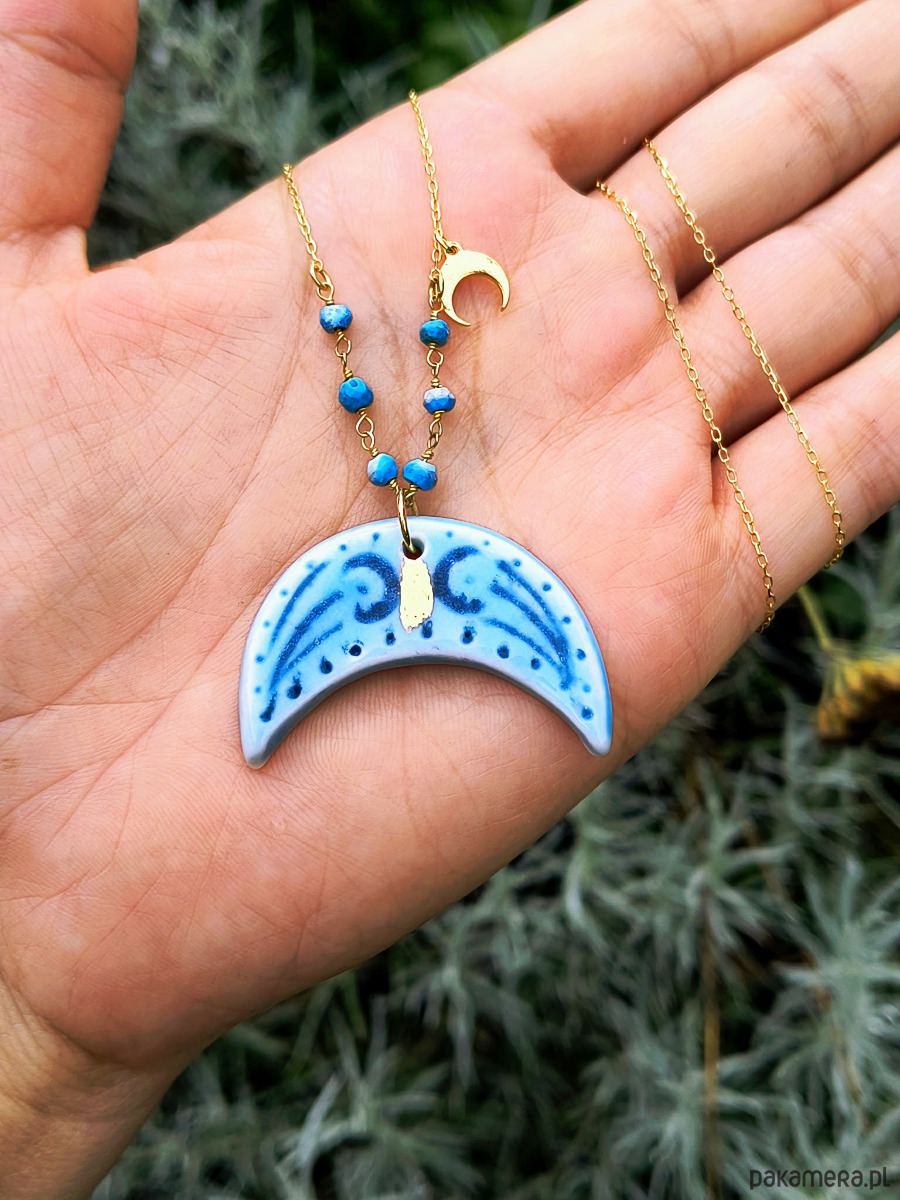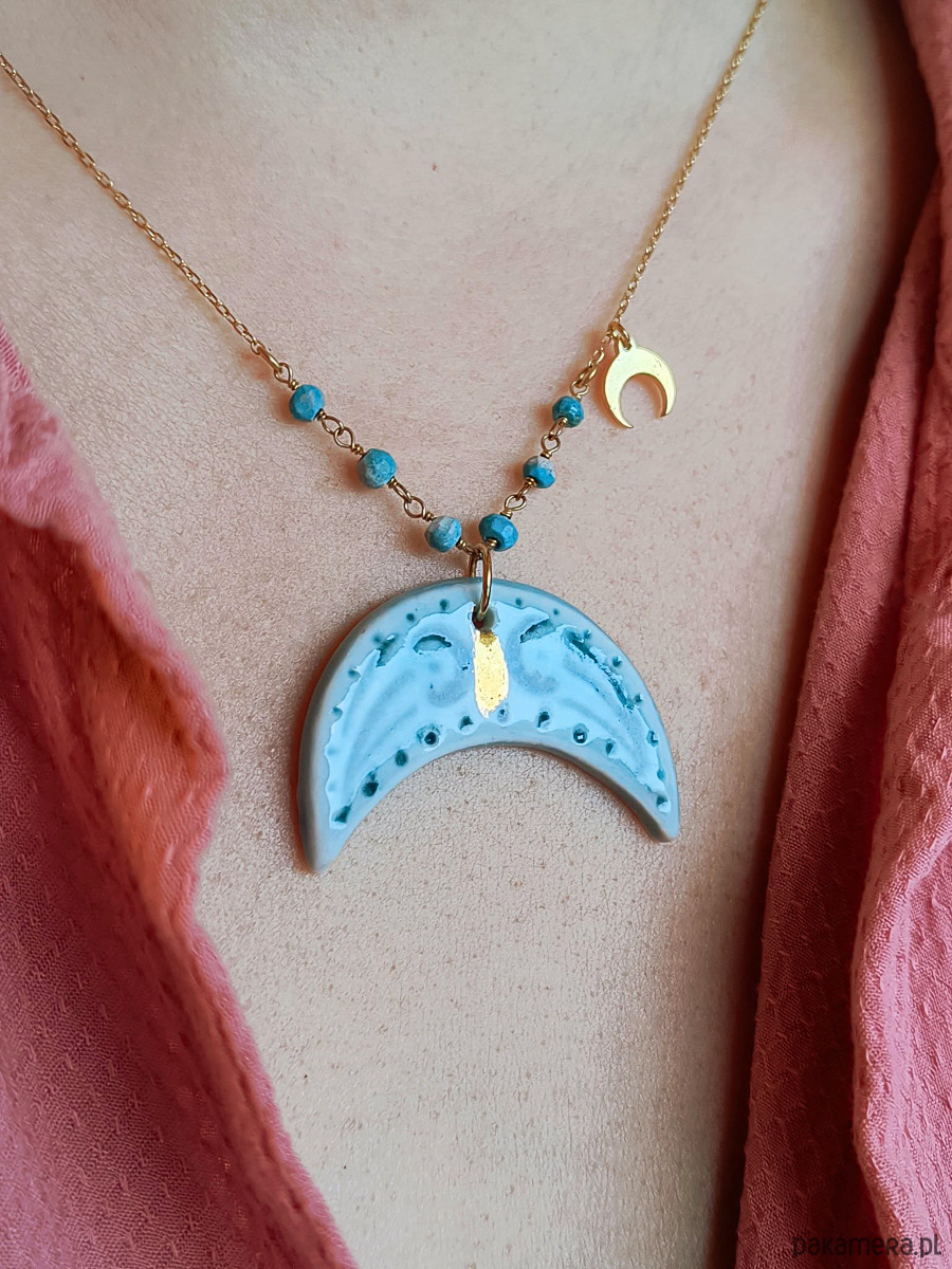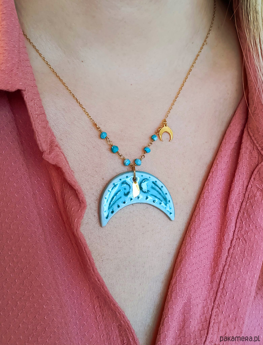 Łańcuszek ozdobiony jest księżycem oraz drobnymi turkusami.