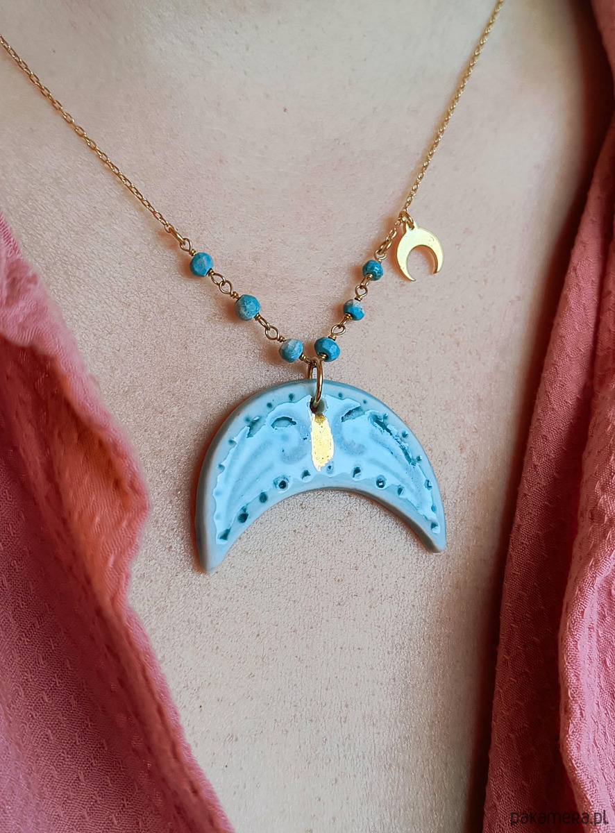 Łańcuszek ozdobiony jest księżycem oraz drobnymi turkusami.
