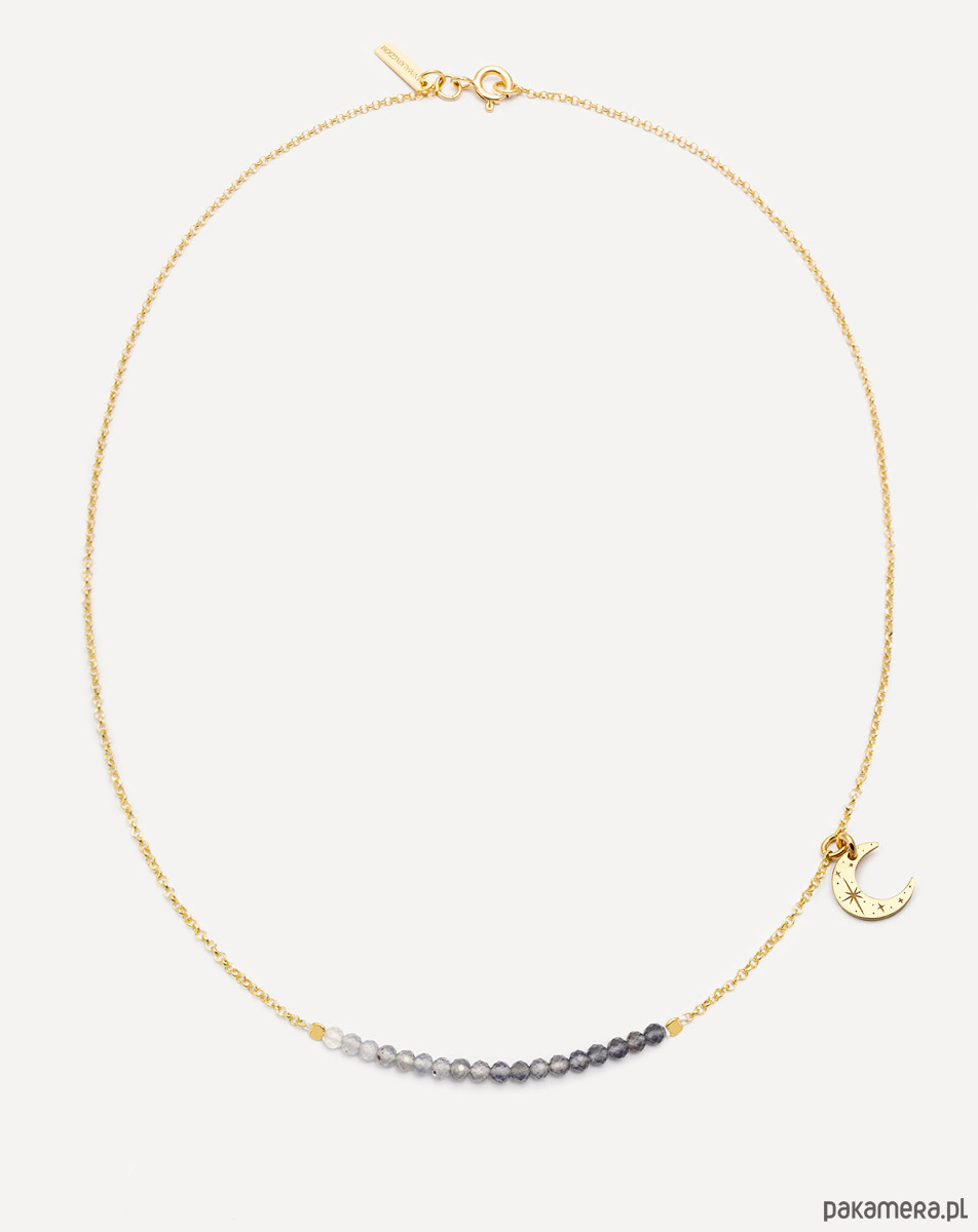 Kochamy kamienie naturalne! Delikatne iolity, galwanizowany kamień księżycowy połączony z kamieniem słonecznym umieściłyśmy na równie subtelnym łańcuszku. Całość wieńczy zimowa zawieszka z unikatowym grawerem.