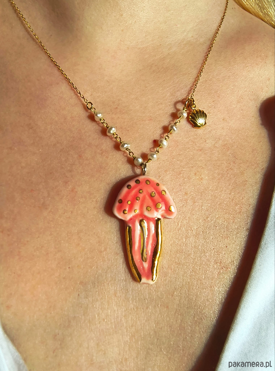 Naszyjnik wykonałam własnoręcznie ze szlachetnej porcelany, zdobiłam szkliwem oraz 24-karatowym złotem.