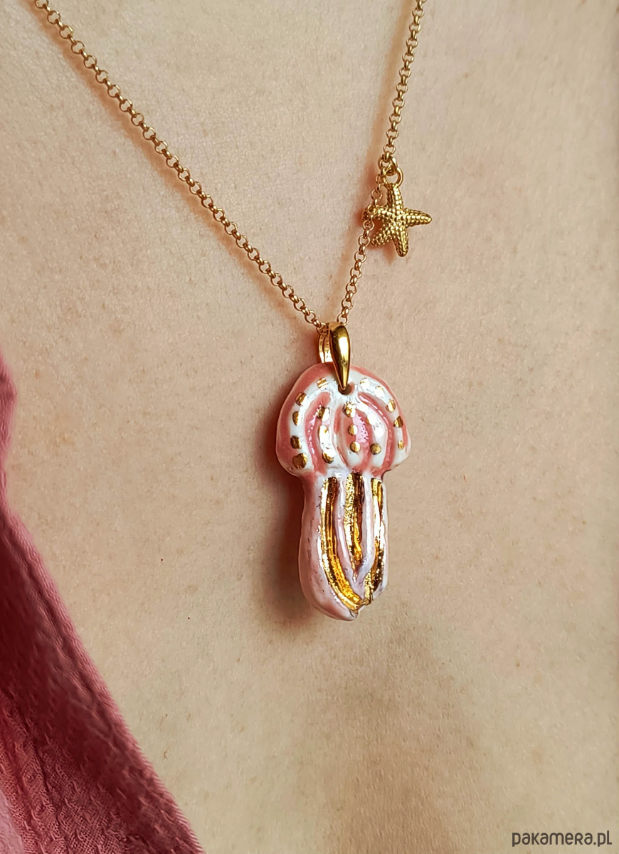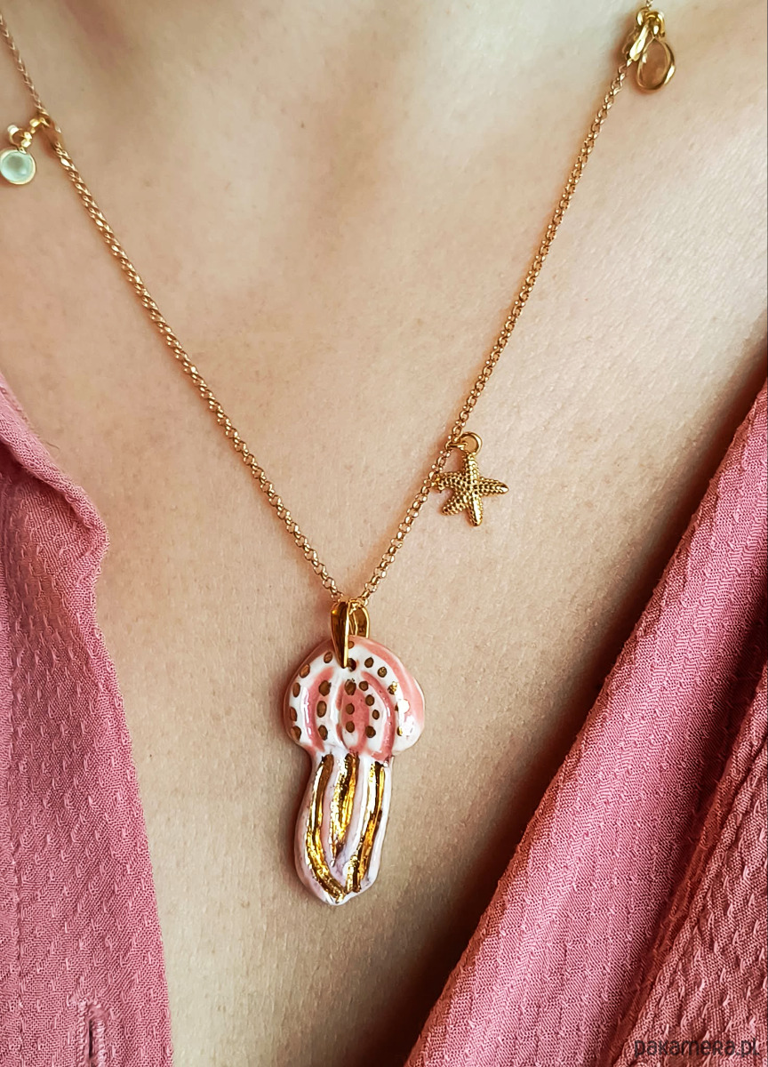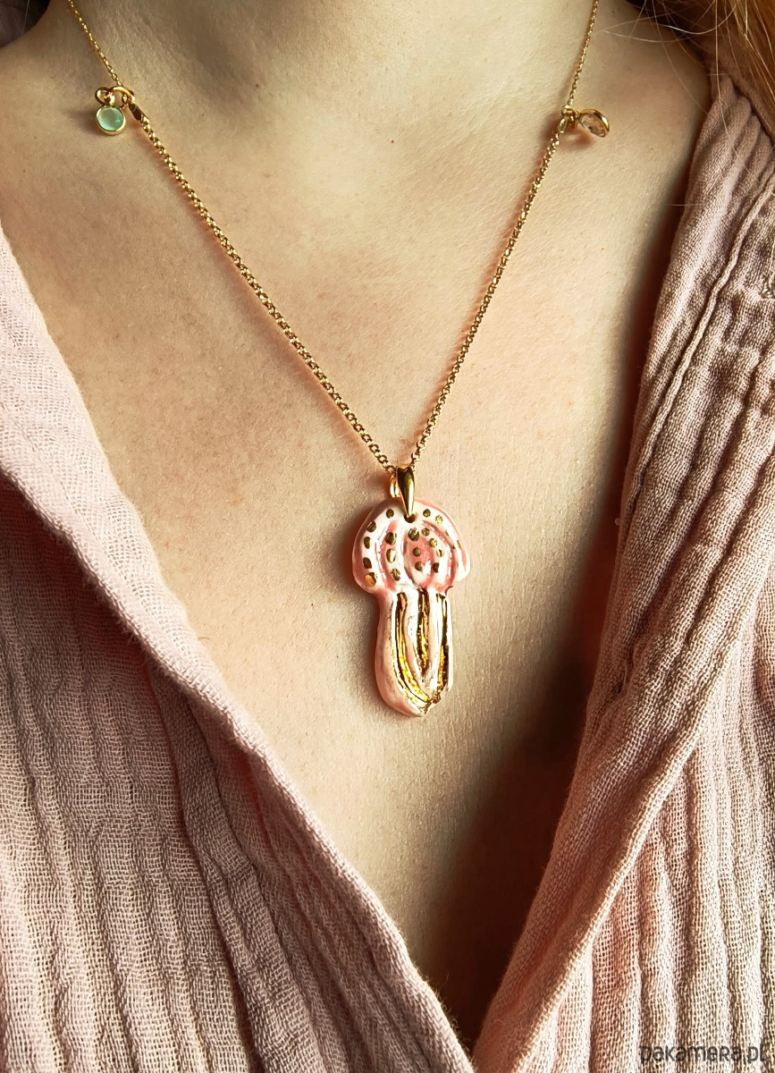 Naszyjnik wykonałam własnoręcznie ze szlachetnej porcelany, zdobiłam szkliwem oraz 24-karatowym złotem.