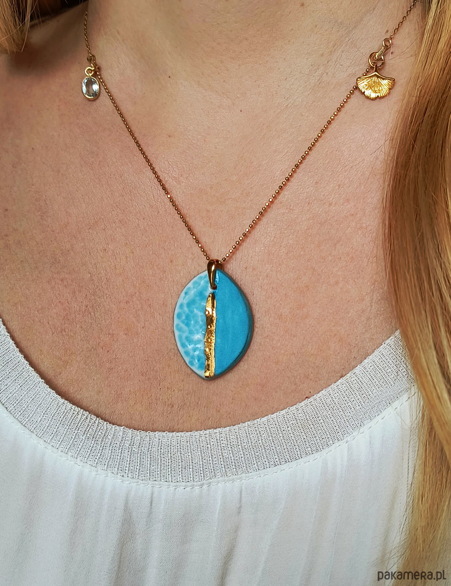 Naszyjnik wykonałam własnoręcznie ze szlachetnej porcelany, zdobiłam szkliwem oraz 24-karatowym złotem.