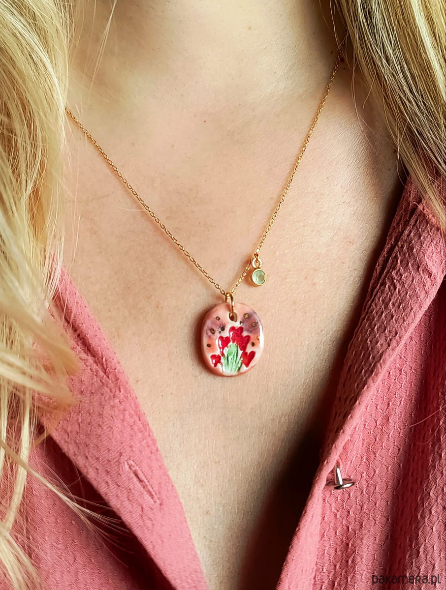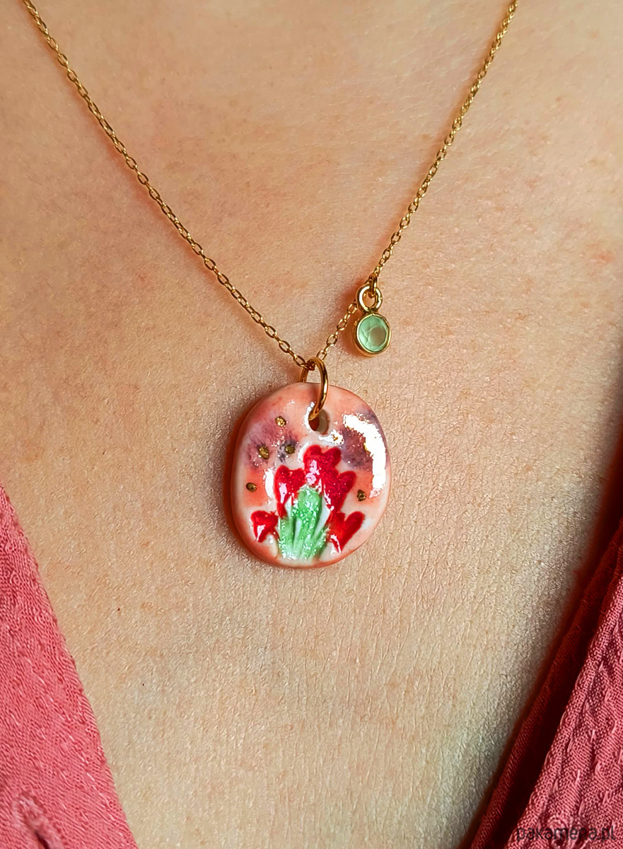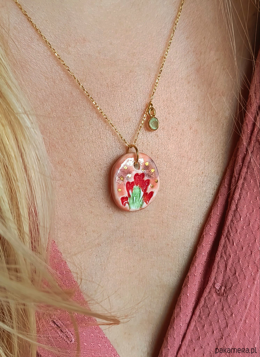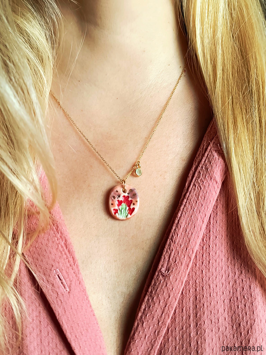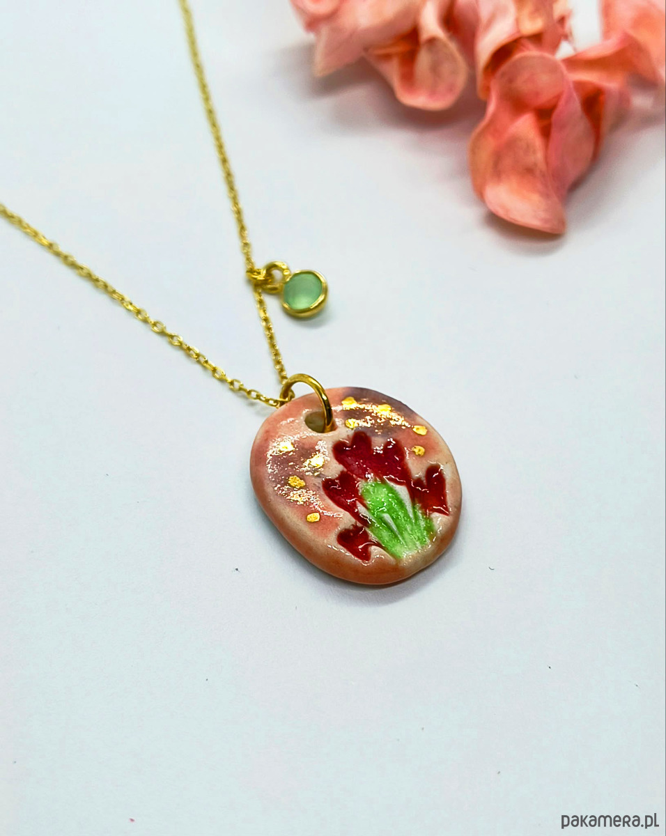 Naszyjnik wykonałam własnoręcznie ze szlachetnej porcelany, zdobiłam szkliwem oraz 24-karatowym złotem.