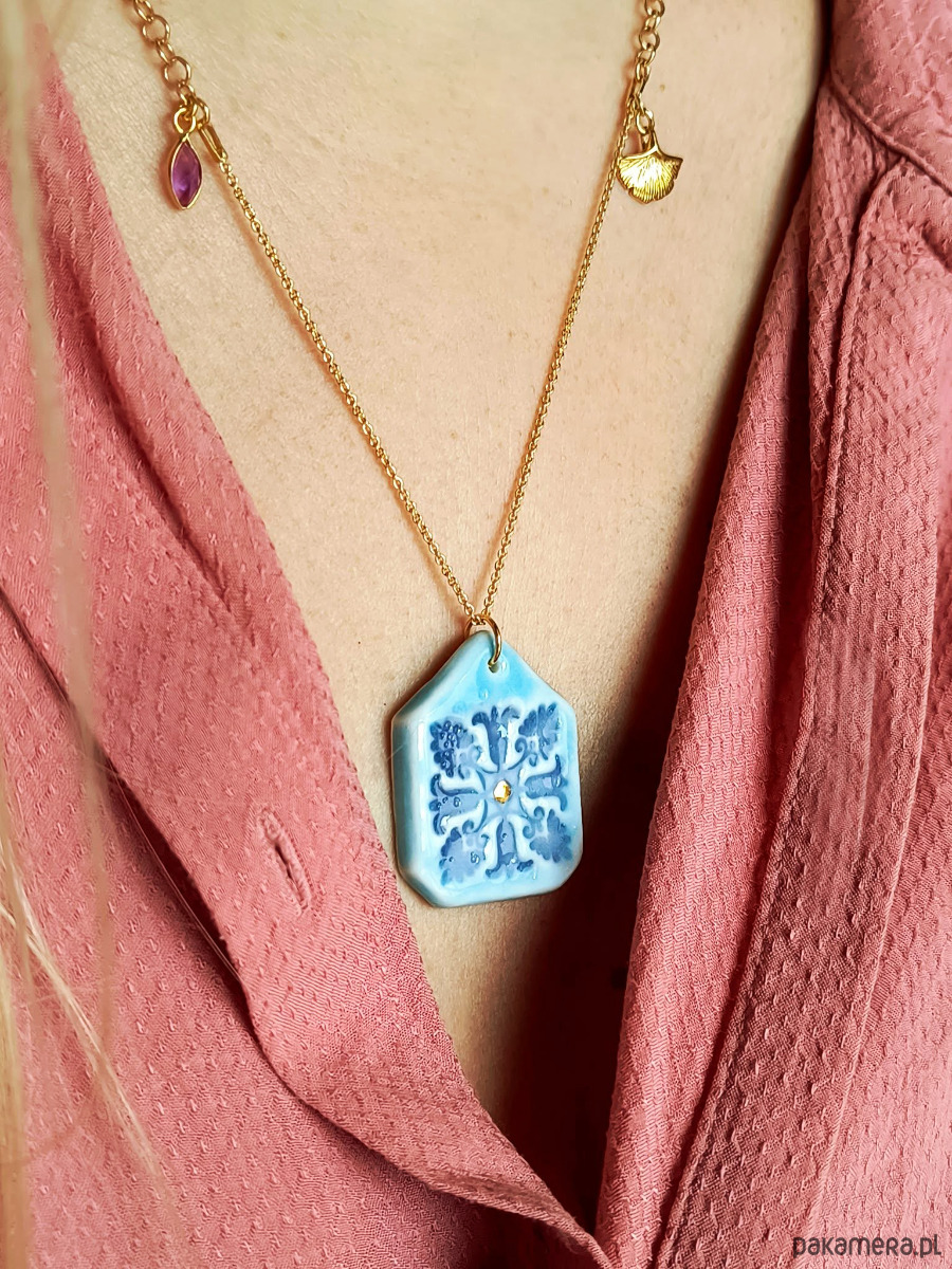 Naszyjnik wykonałam własnoręcznie ze szlachetnej porcelany, ozdobiłam szkliwem oraz 24-karatowym złotem.