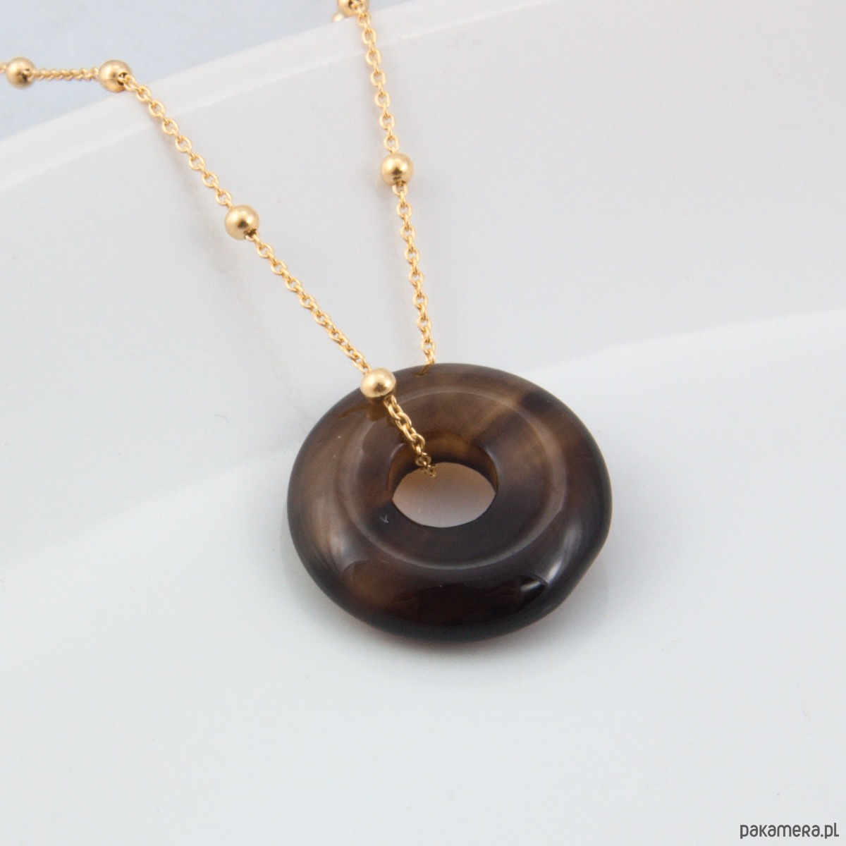 Naszyjnik wykonany z bezniklowego srebra próby 925 pozłacanego żółtym złotem oraz okrągłego kamienia naturalnego w kształcie donuta.