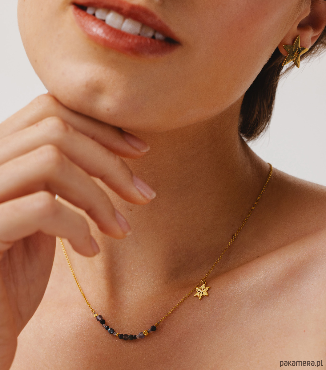 Delikatny, a jednocześnie pełen charakteru naszyjnik, który lubi przyciągać spojrzenia. Twój ulubiony zimowy talizman łączy się tu z naturalnymi kamieniami, tworząc szlachetny zestaw. Kamienie układamy ręcznie w unikatowy wzór inspirowany dniem — w ciepłych, świetlistych tonach — lub nocą, w odcieniach ciemnego, rozgwieżdżonego nieba.
