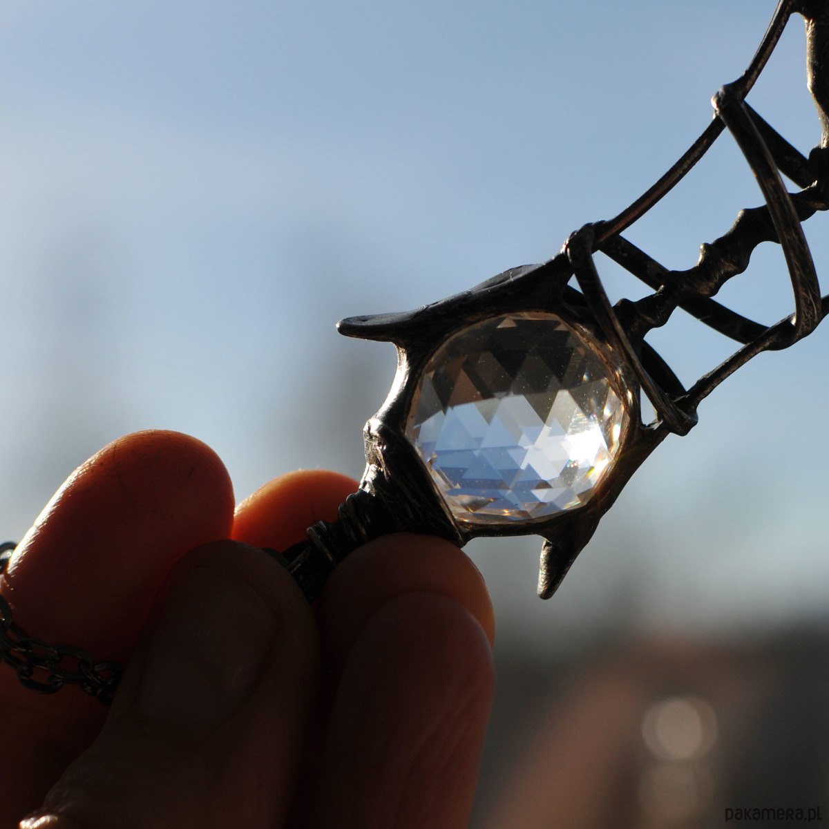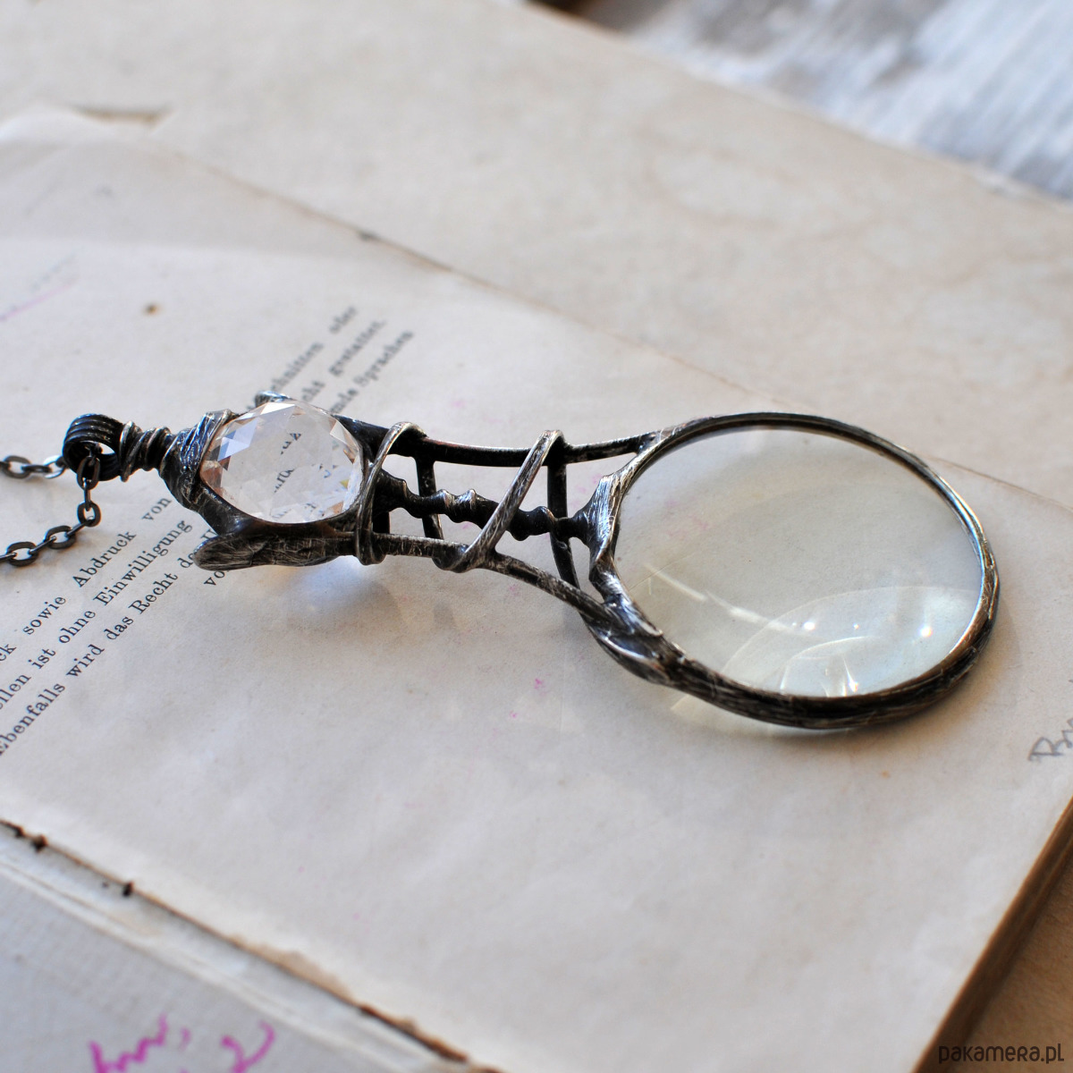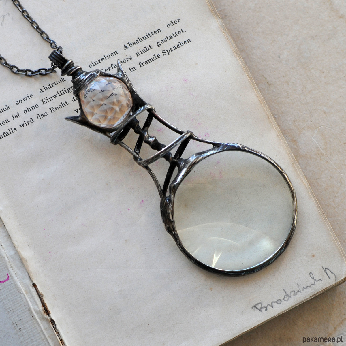 Okazały, wisior na długim łańcuszku, z prawdziwą lupą i diamentową kulką.