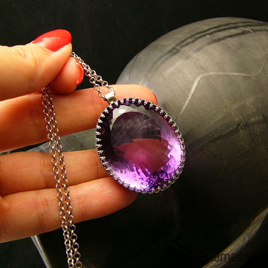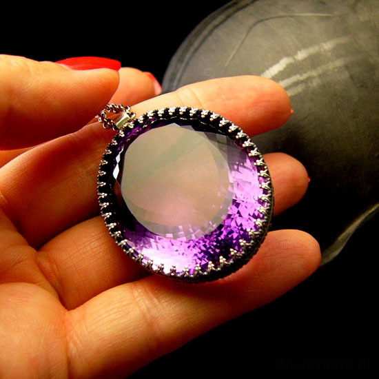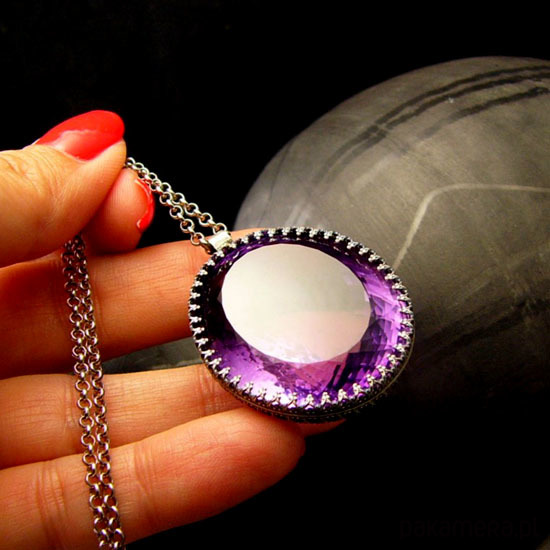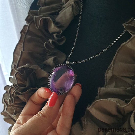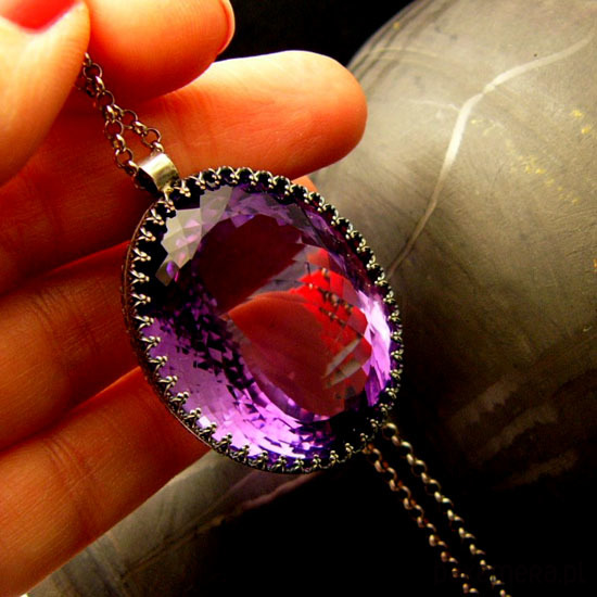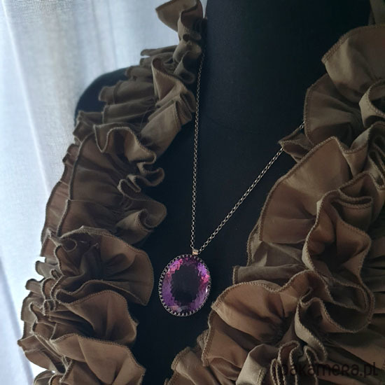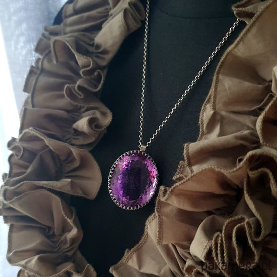 Naszyjnik którego sercem jest przepięknej urody ogromny Ametyst o niesamowitym szlifie otulony w srebrne koronki w wadze 105ct - karat. Wisior jest dwustronny. Całość wykonana ręcznie na srebrze próby 925, oksydowana przetarta i wypolerowana na wysoki połysk. Długość całkowita wisiora 4 cm, szerokość 3 cm. Łańcuszek o długości 75 cm w tym 5 cm regulacji. Ametyst jest kamieniem medytacji, uspakaja nerwy, napięcie, uzdrawia duchowo. Naszyjnik jest Unikatem. Zdjęcie wykonane na manekinie o rzeczywistych ludzkich rozmiarach.