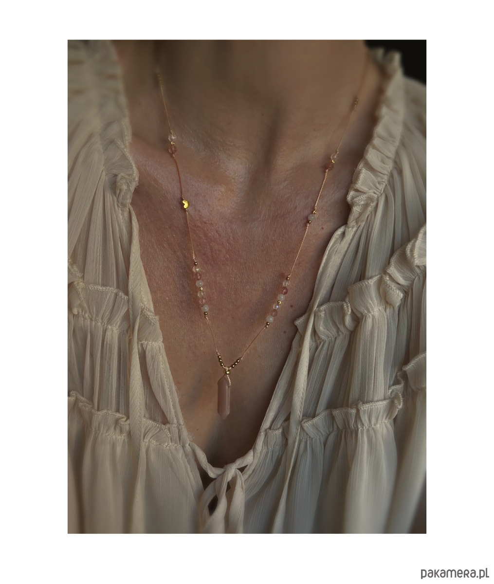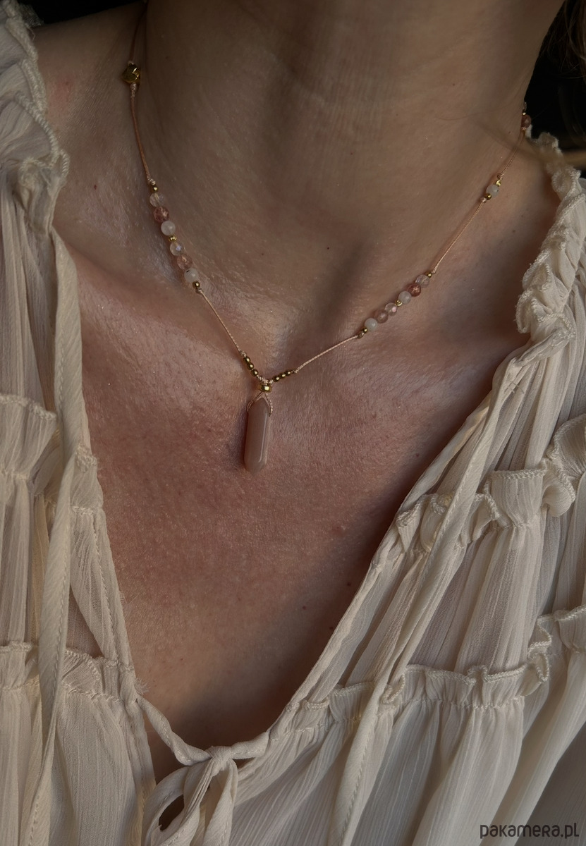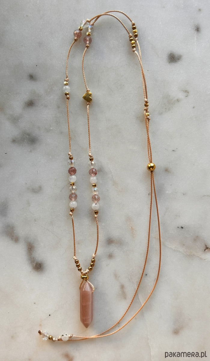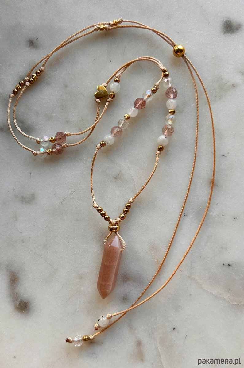 Regulowany naszyjnik z kwarcem różowym, kamieniem słonecznym i księżycowym oraz Kryształem Górskim .