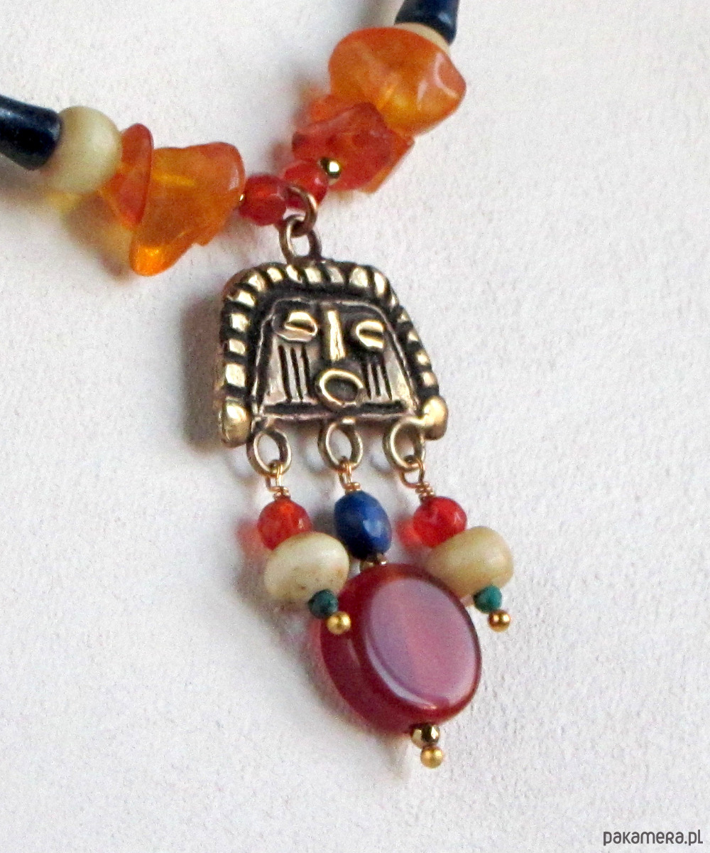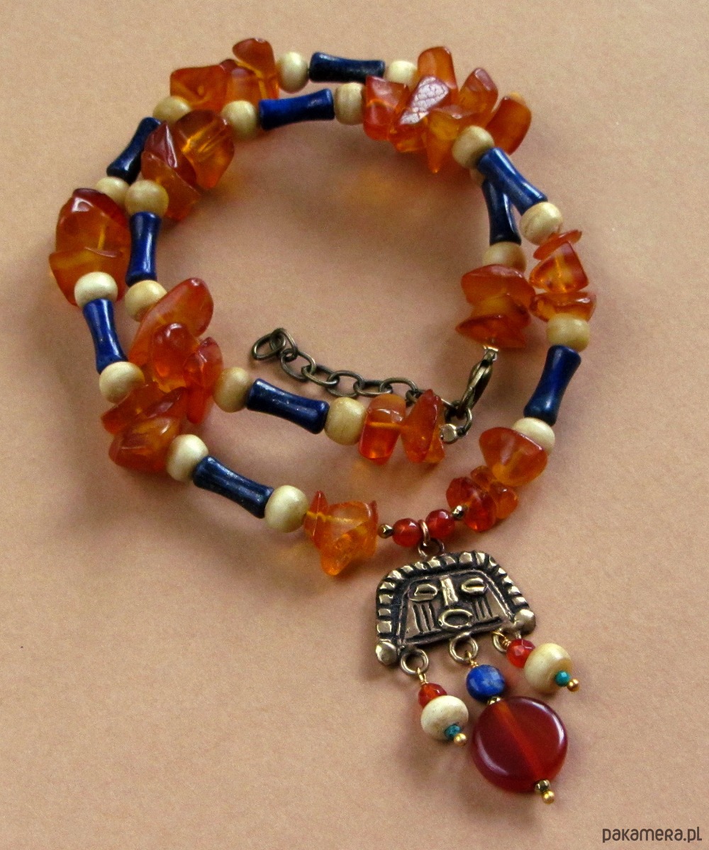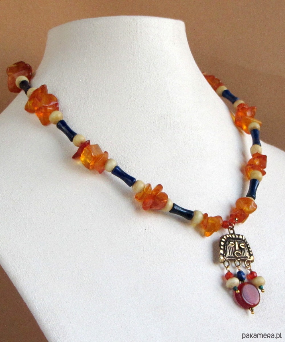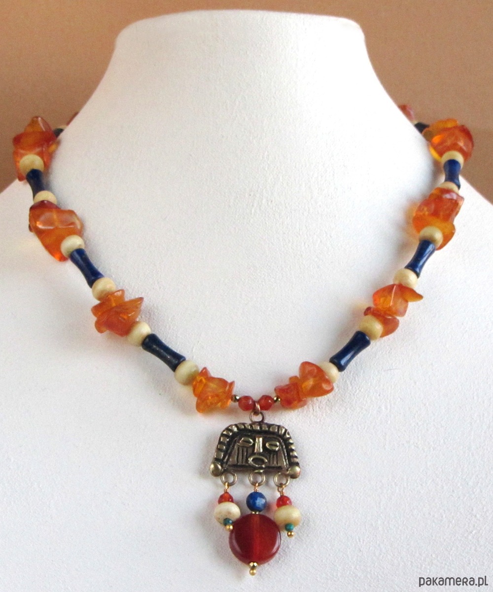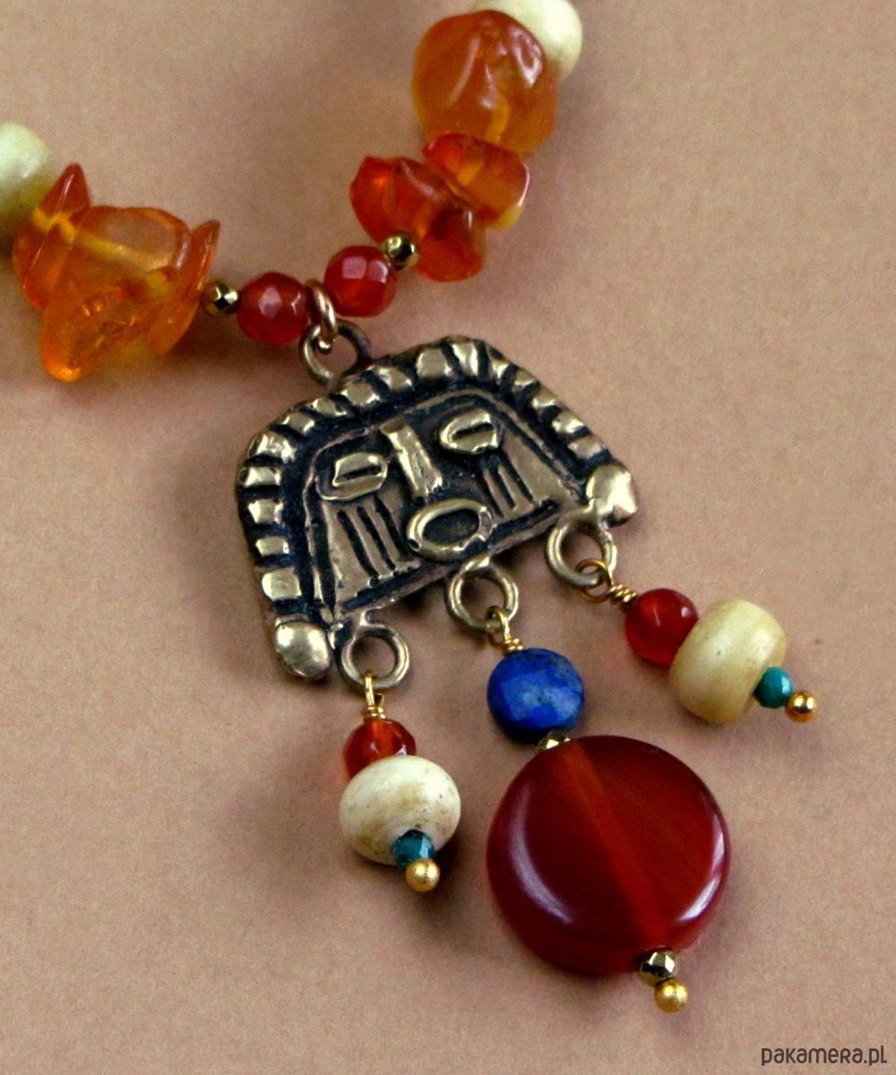 Słoneczny naszyjnik z zawieszką boga Inti. Zawieszka inspirowana azteckimi wierzeniami została wykonana z brązu w krakowskiej pracowni. Całość wykończona nieregularnymi bryłkami bursztynu, wałeczkami lapis lazuli oraz kościanymi koralikami z recyklingu. Naszyjnik inspirowany kulturą i wierzeniami Azteków, bogiem Słońca- Inti. Amulet ma przynosić moc i siłę.