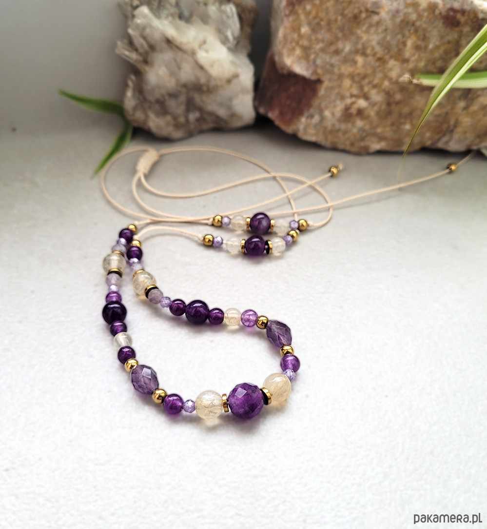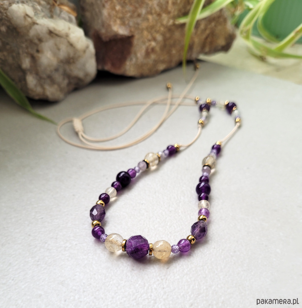 Piękny naszyjnik z kamieni naturalnych: Ametystu, Cytrynu, Hematytu w kolorze złota oraz Cyrkonii.