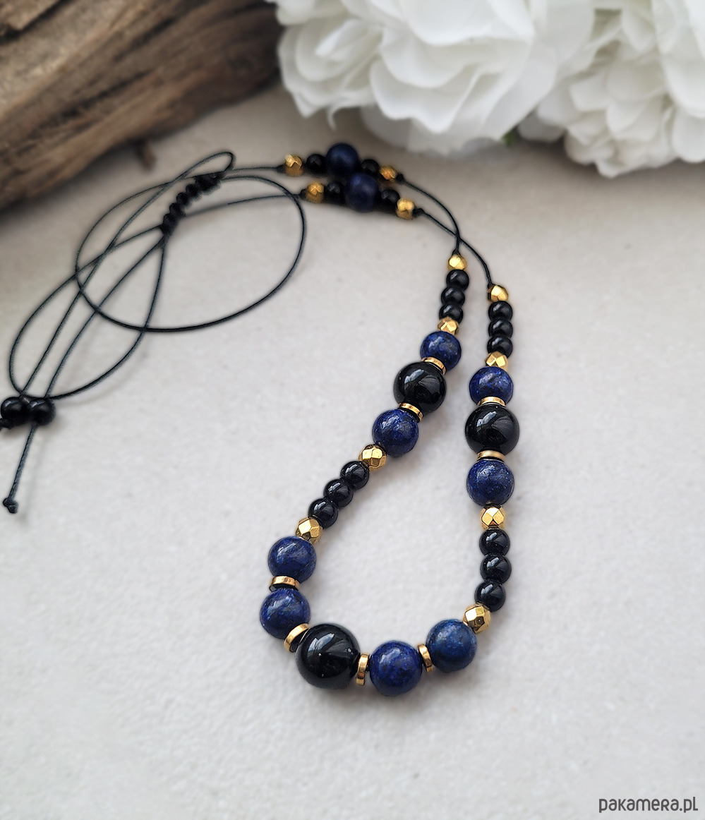 Piękny naszyjnik z kamieni naturalnych: Lapis lazuli, Onyksu, Obsydianu oraz Hematytu w kolorze złota oraz Jedeitu topazowego.