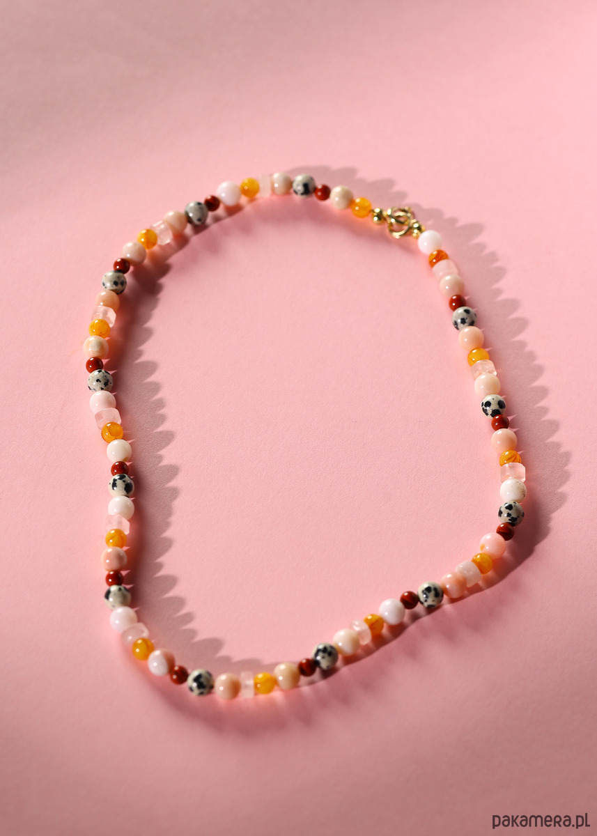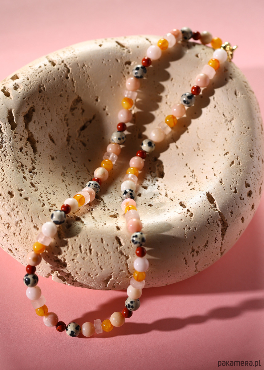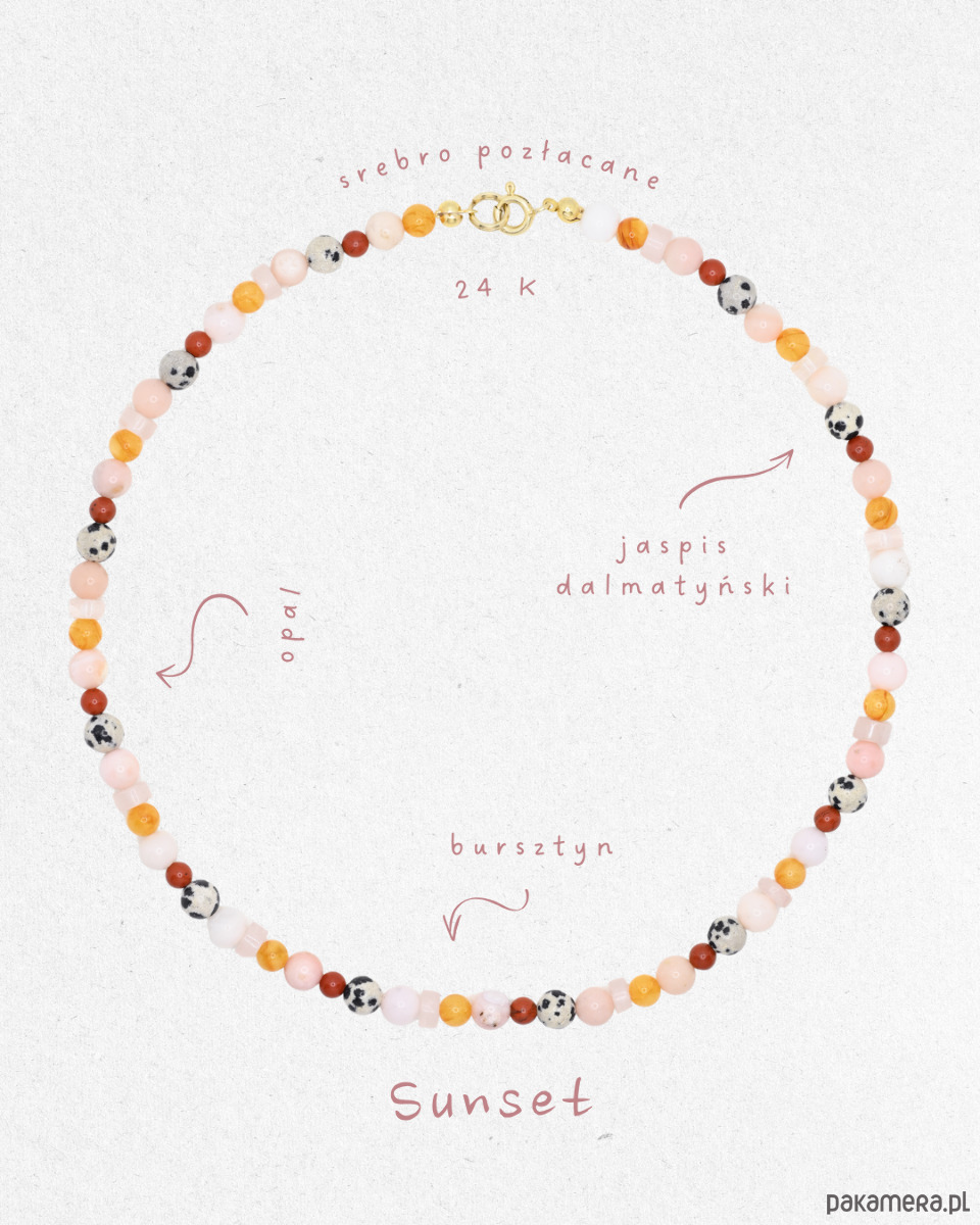 Delikatny, naszyjnik typu choker inspirowany kolorami zachodu słońca. Subtelne zestawienie kamieni naturalnych i bursztynu tworzy ciepłą, harmonijną kompozycję w odcieniach różu, miodu i terakoty. To lekka, elegancka biżuteria, która pięknie układa się przy szyi i pasuje zarówno do codziennych stylizacji, jak i bardziej eleganckich zestawów.