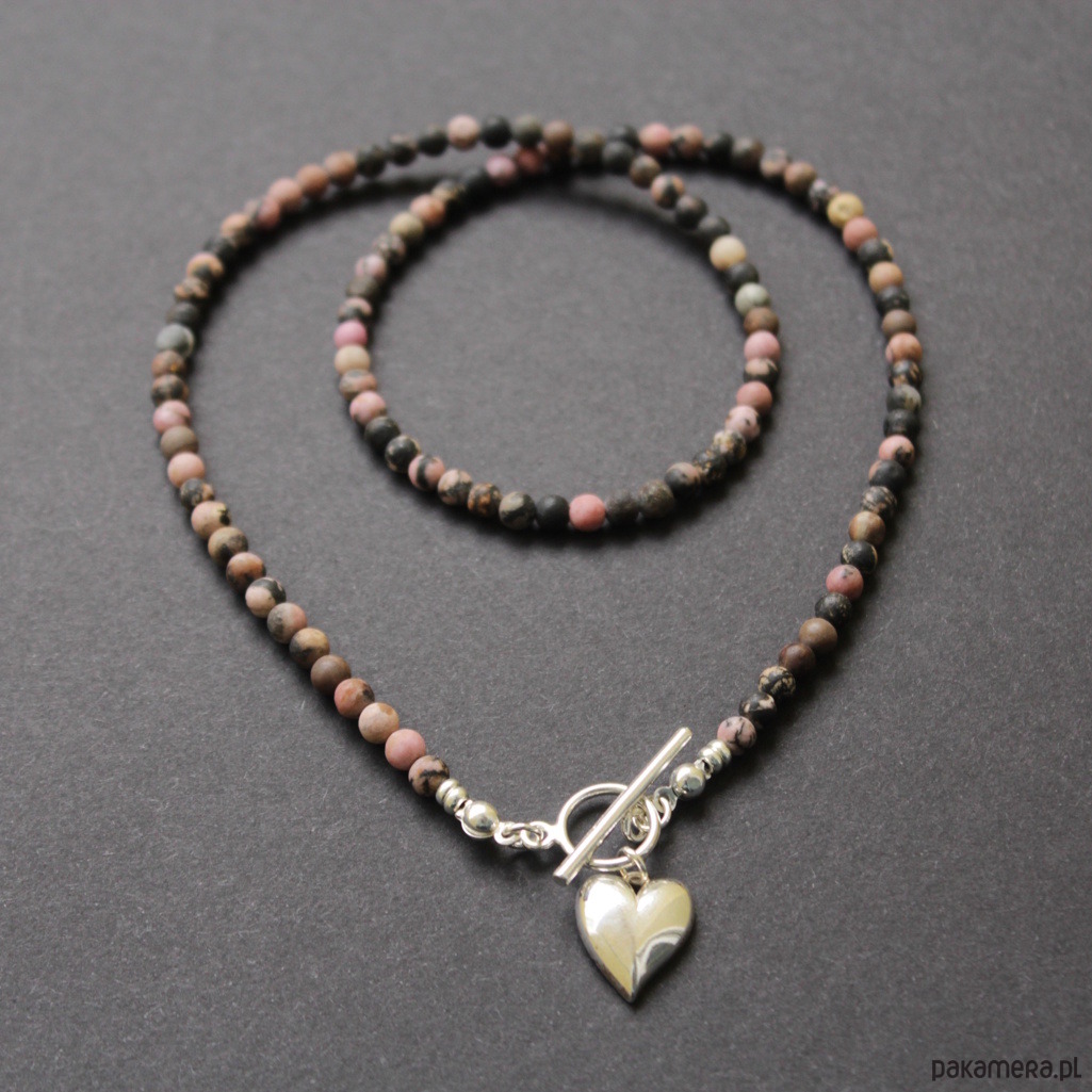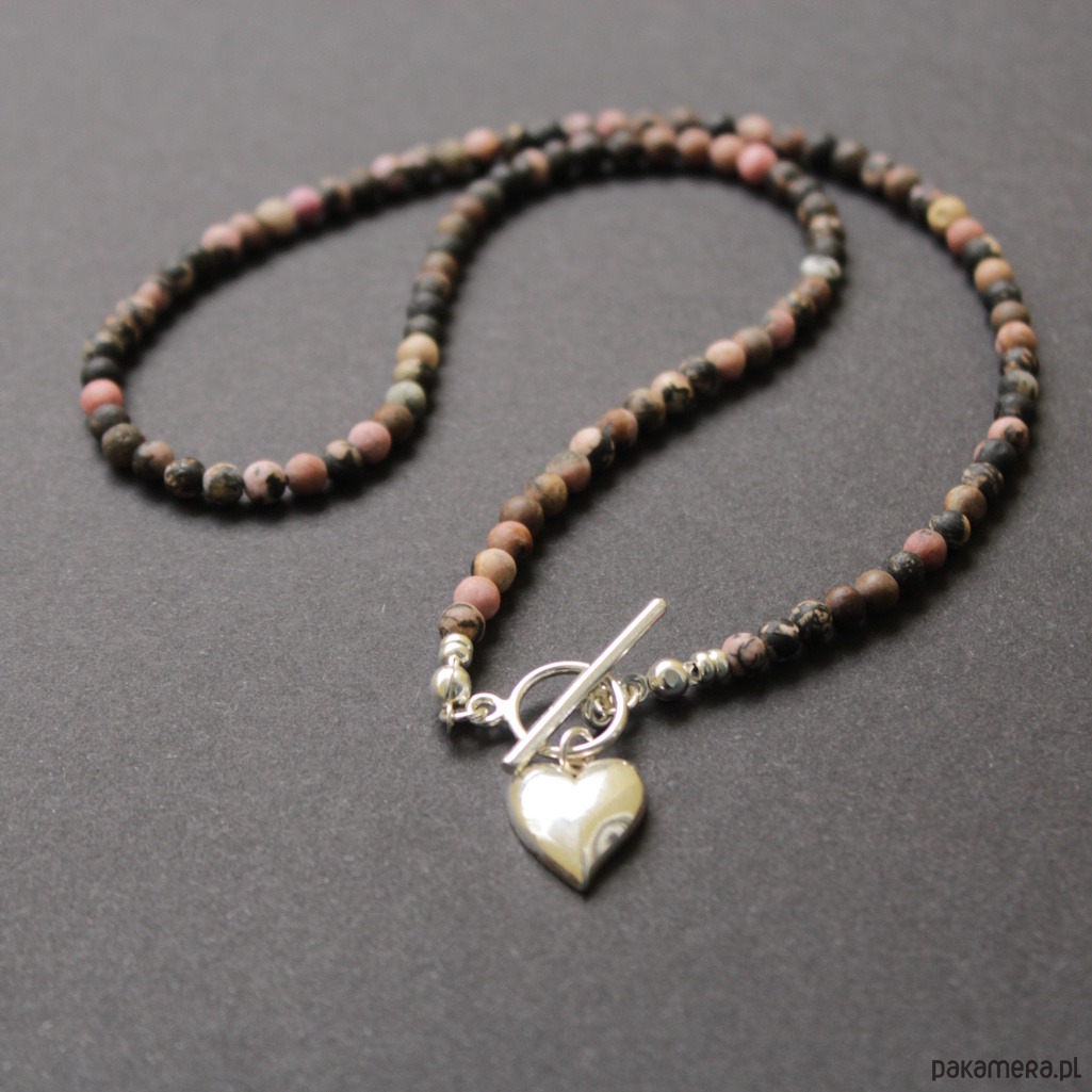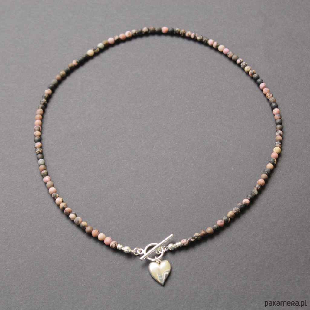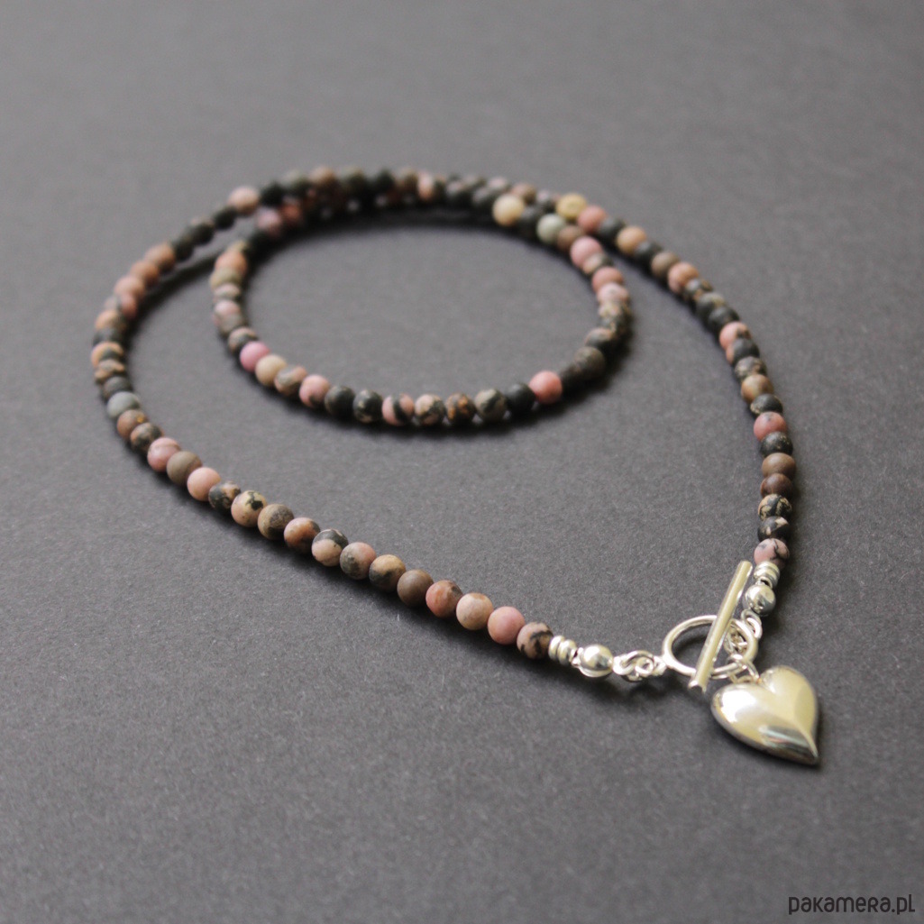 Naszyjnik wykonany został ze srebra próby 925 oraz przepięknych matwych kuleczek rodochrozytów wielkości 0,4 cm.
