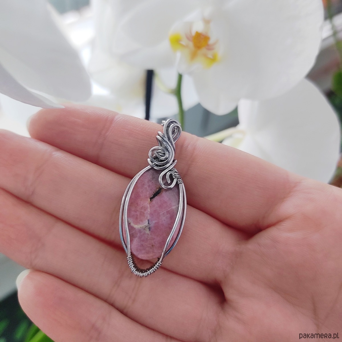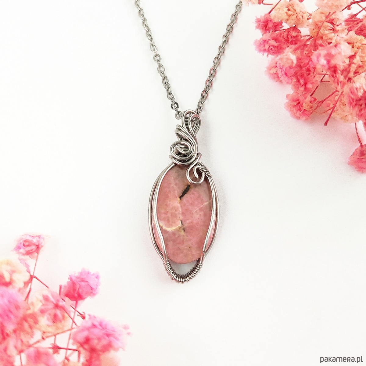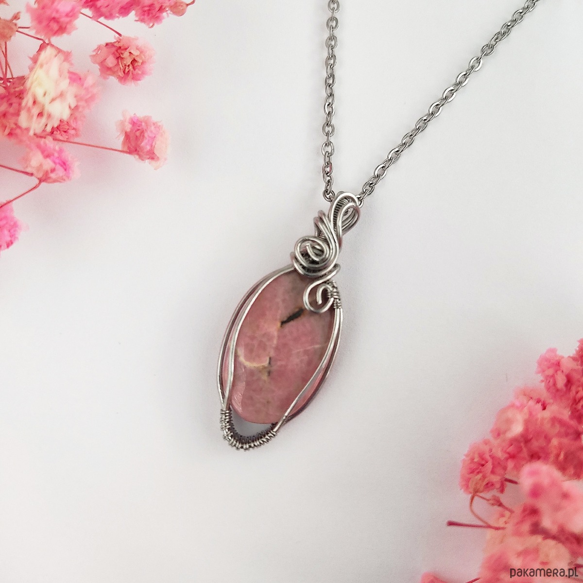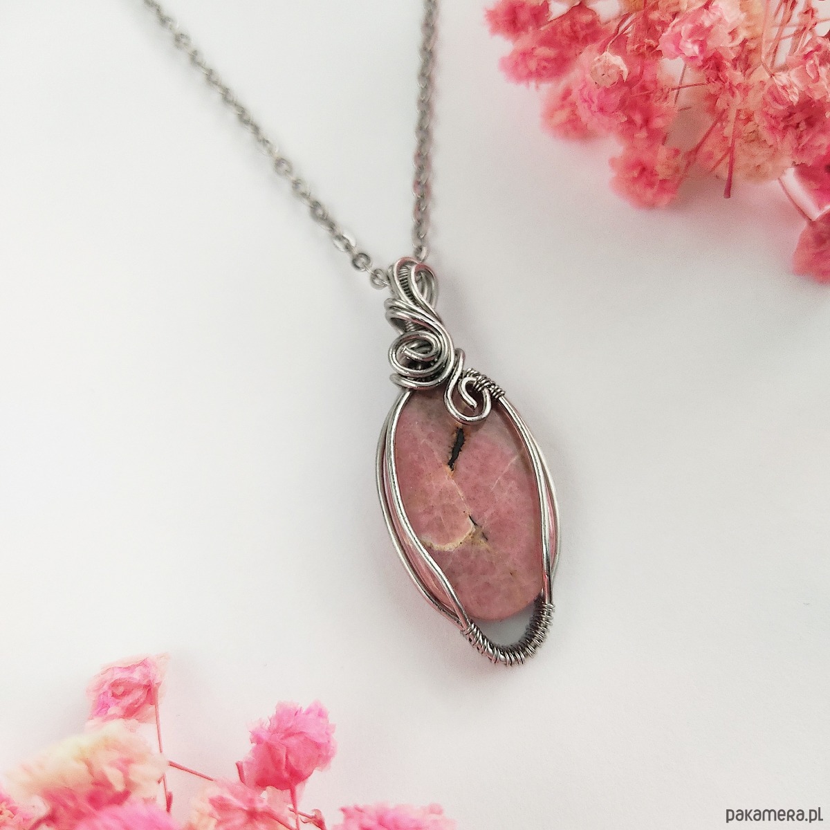Naszyjnik Rodonit ręcznie robiony. Wykonany techniką wire wrapping z drutów ze stali chirurgicznej.