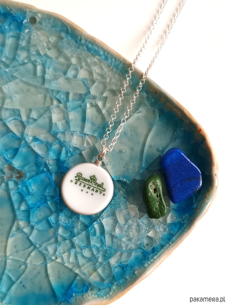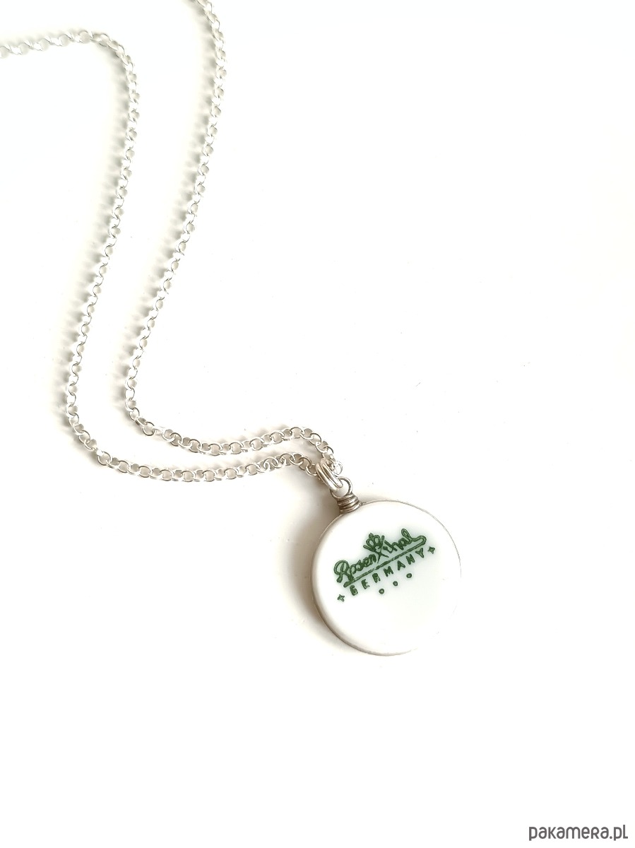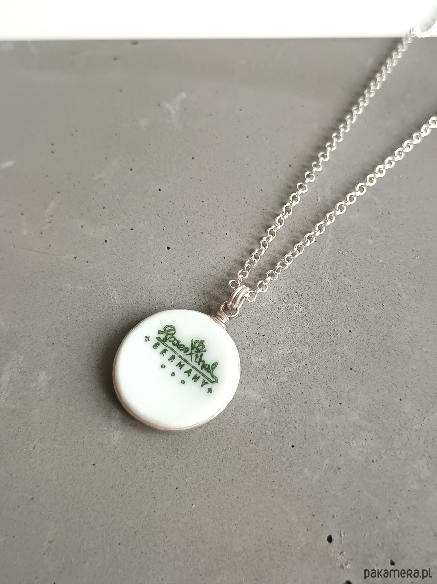 Oto naszyjnik, który wykonałam z fragmentu stłuczonego talerza Rosenthal z widoczną sygnaturą. Kawałek stłuczki oszlifowałam nadając okrągły ksztalt, oprawiłam w drucik i zamocowałam na srebrnym łańcuszku (srebro 925). Brzegi pokryłam lakierem, co sprawia, że nie brudzą się i nie chłoną wilgoci. Średnica zawieszki ceramicznej: 17 mm. Długość łańcuszka w całości: 45 cm. Unikat - każdy z moich wyrobów występuje w jednym egzemplarzu. Upcykling - nie reprodukuję wykorzystywanych wzorów, niczego nie domalowuję - wykorzystuję wyłącznie oryginalne naczynia i motywy, które się na nich znajdują. Tym samym, stłuczce z odzysku nadaję nowe życie.
