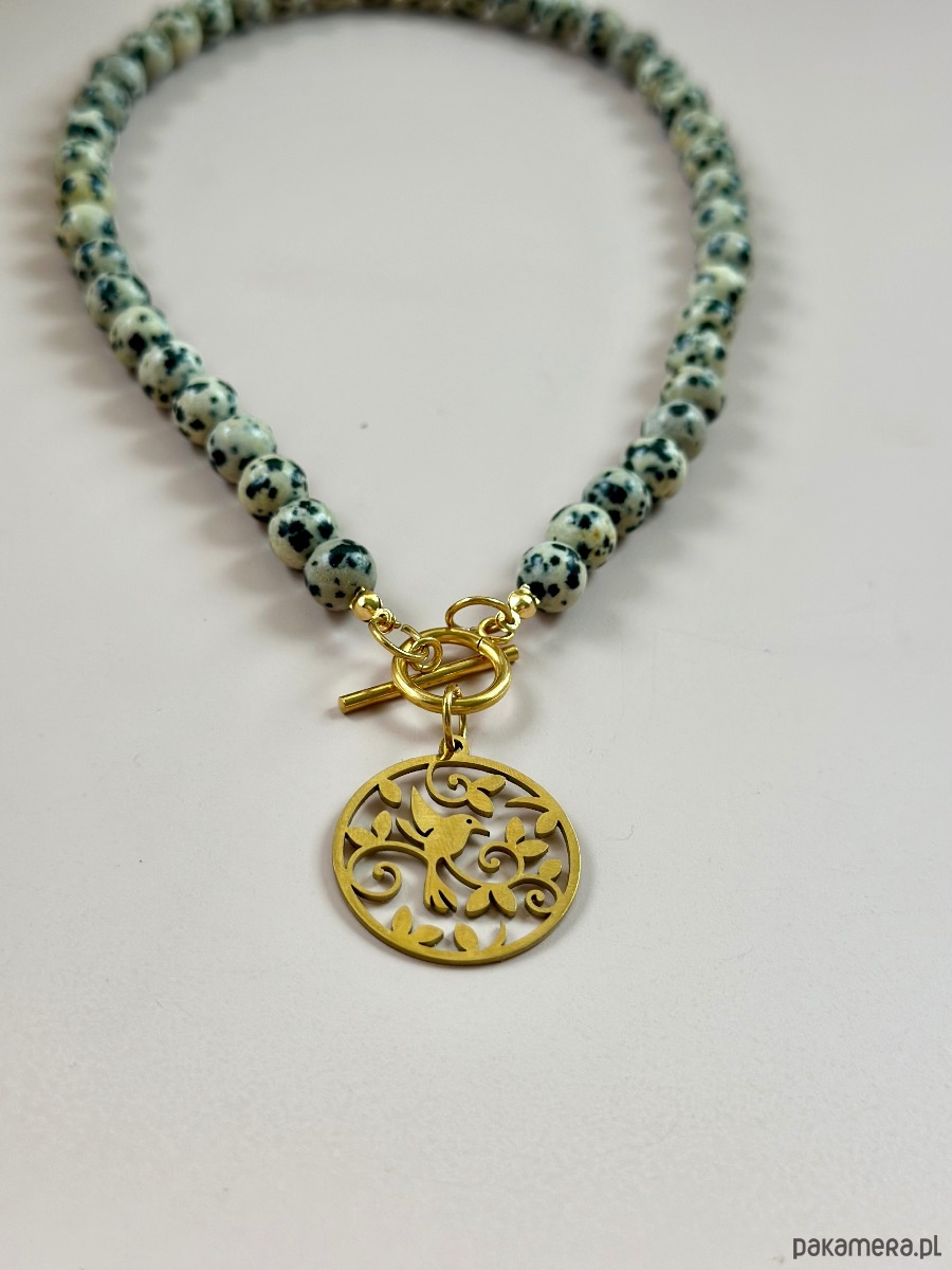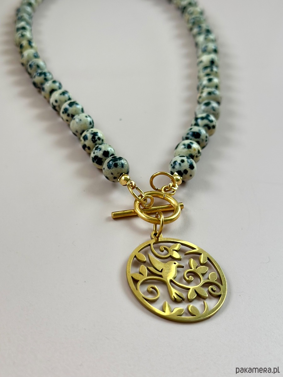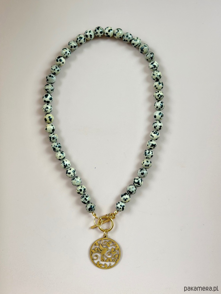 Naszyjnik z zapięciem Toggle w kolorze złota. Wykonany ręcznie przy użyciu dużych jaspisów dalmatyńskich i pięknej zawieszki. Duży kamień wrzuca grosz przepychu jednak ubrany w lekkość romantyzmu daje efekt niesłychanie przyciągający spojrzenia