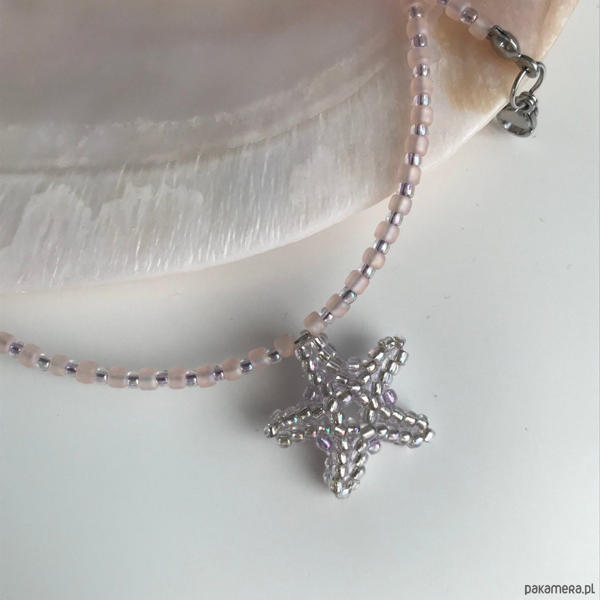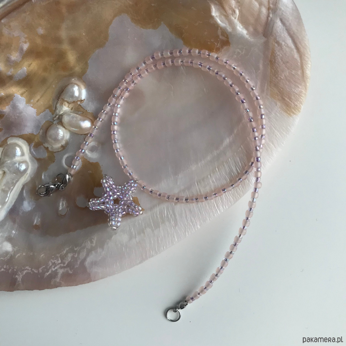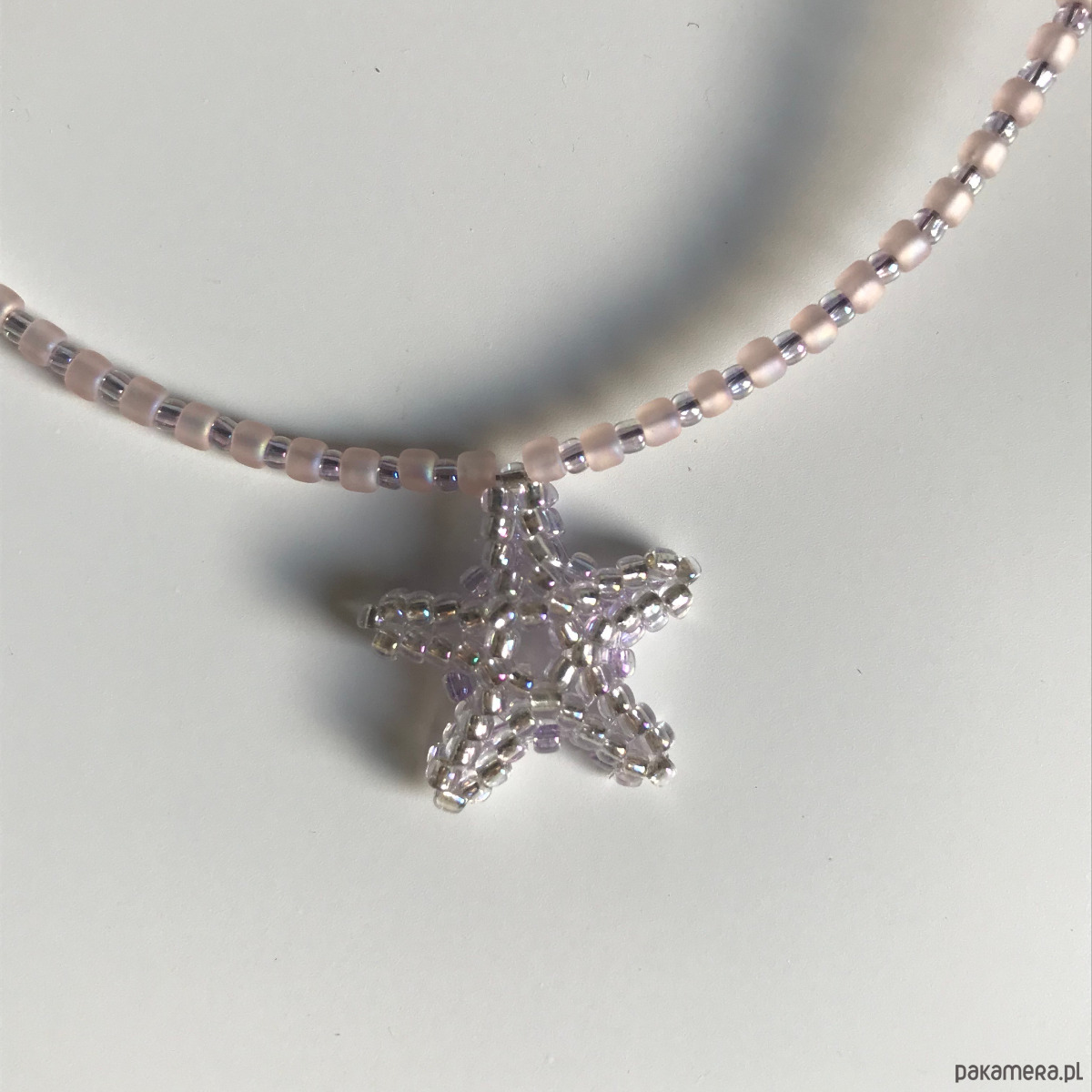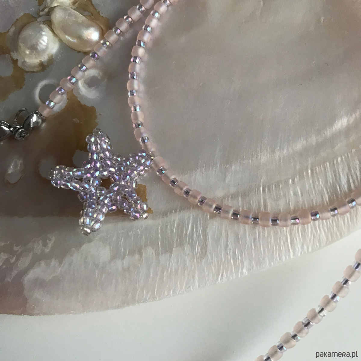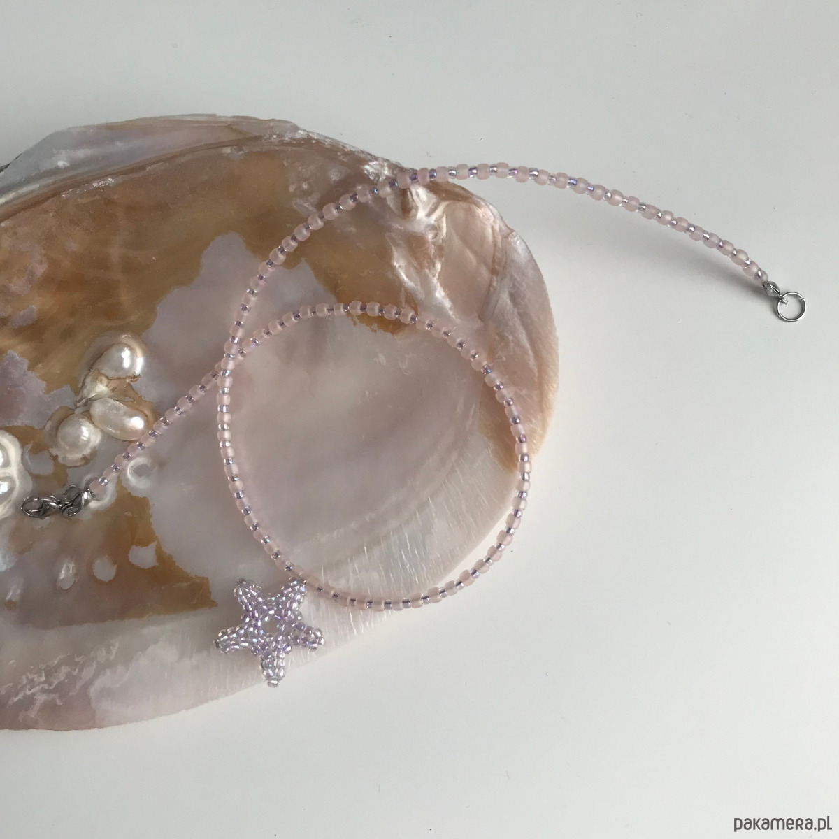 Dwustronny naszyjnik rozgwiazda wykonany ze szklanych, japońskich koralików. Po jednej strony pudrowy mieniący się lekko fiolet, a po drugiej srebrny :) Dwukolorwy sznur delikatnych pastelowych koralików.