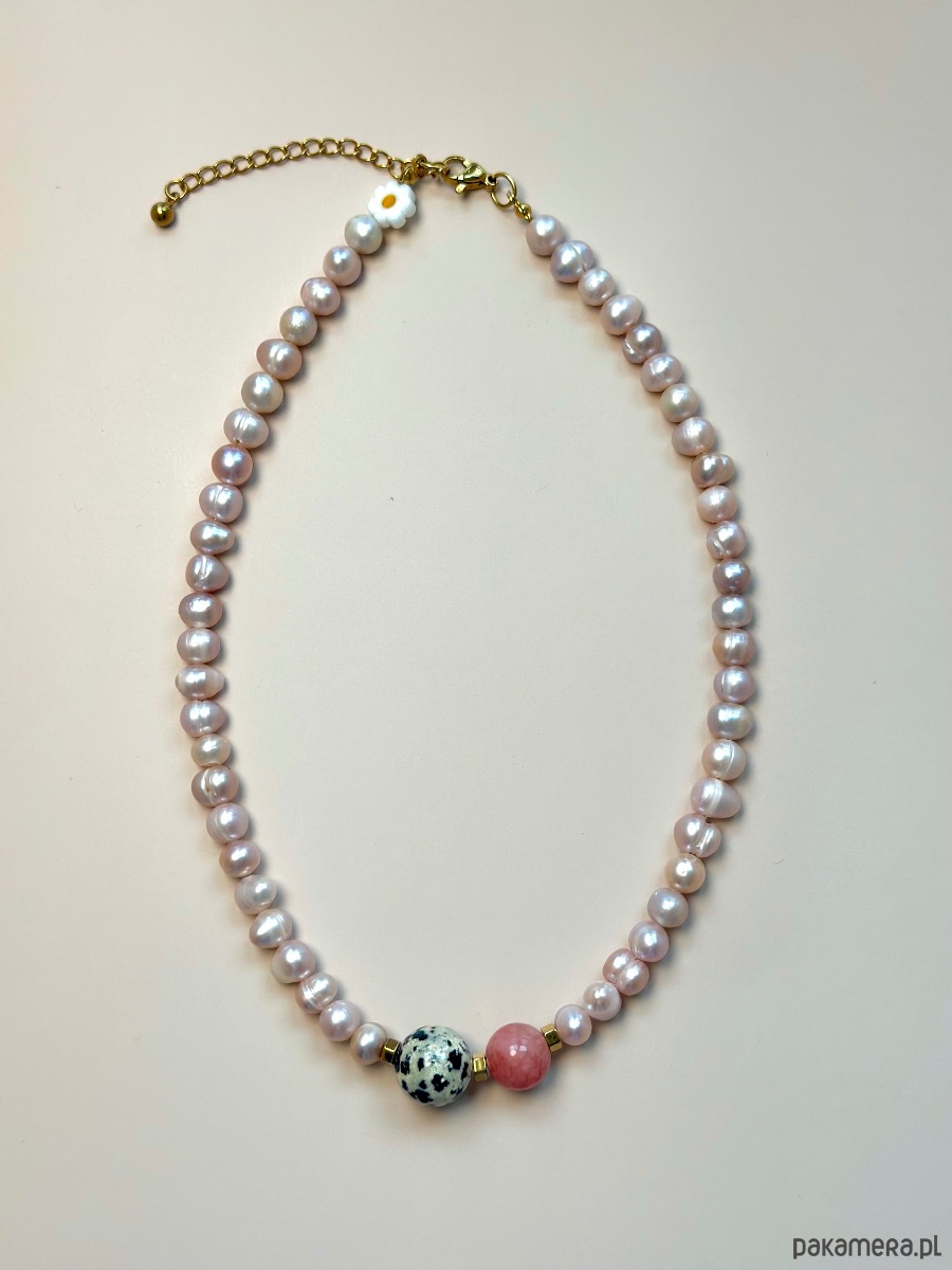 Przepiękny naszyjnik wykonany ręcznie . Wyjątkowo piękna perła hodowlana w odcieniu różu i fioletu. Bardzo urodziwa❤️🌸 o nieregularnym kształcie nadaje temu naszyjnikowi wyjątkowości .