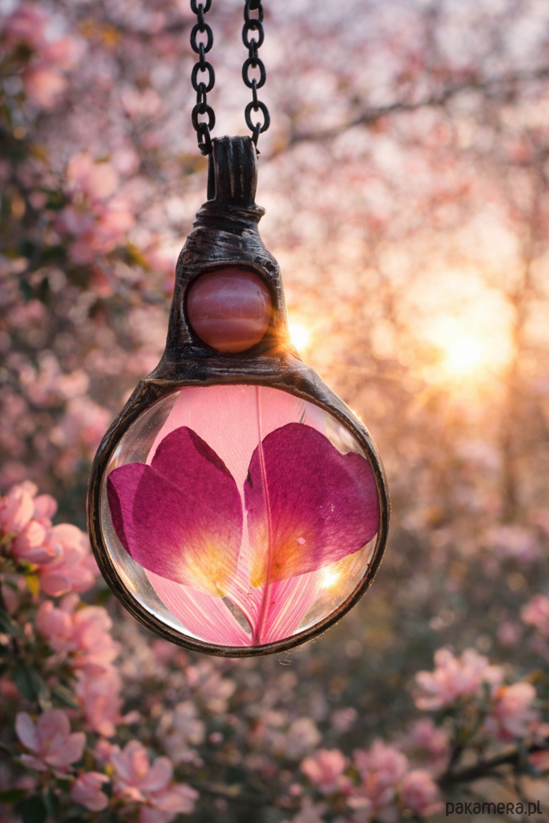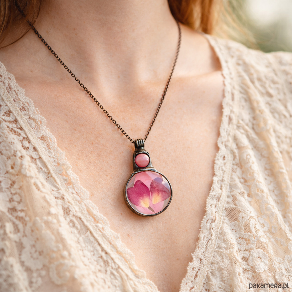 W szklanym medalionie znajduje się delikatne różowe piórko oraz prawdziwe płatki róży ułożone w kształt serca. Kompozycja tworzy subtelną, romantyczną biżuterię inspirowaną naturą i delikatnymi detalami.
