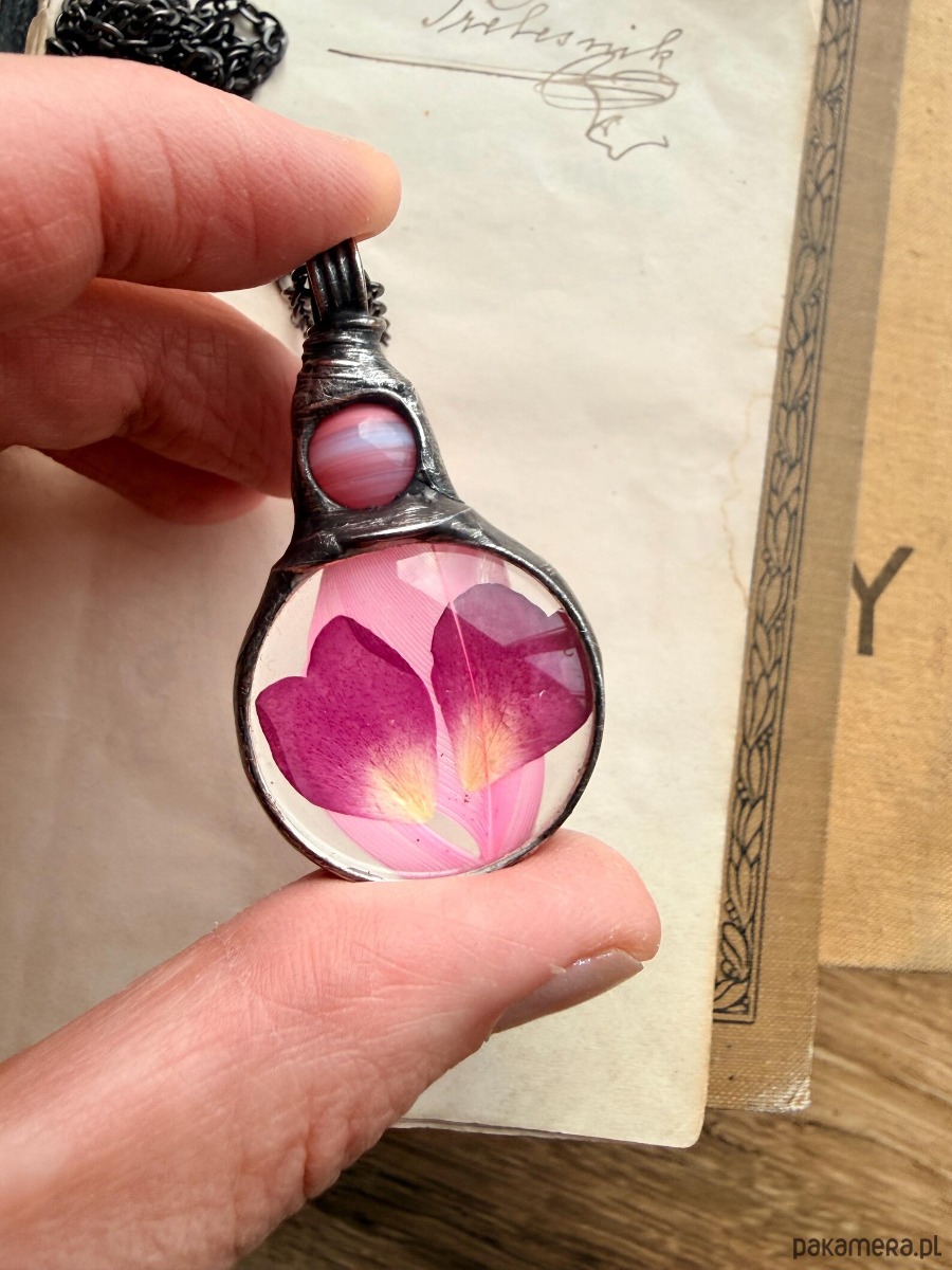 Ręcznie wykonany naszyjnik z różowym piórkiem i płatkami róży zamkniętymi w szkle.