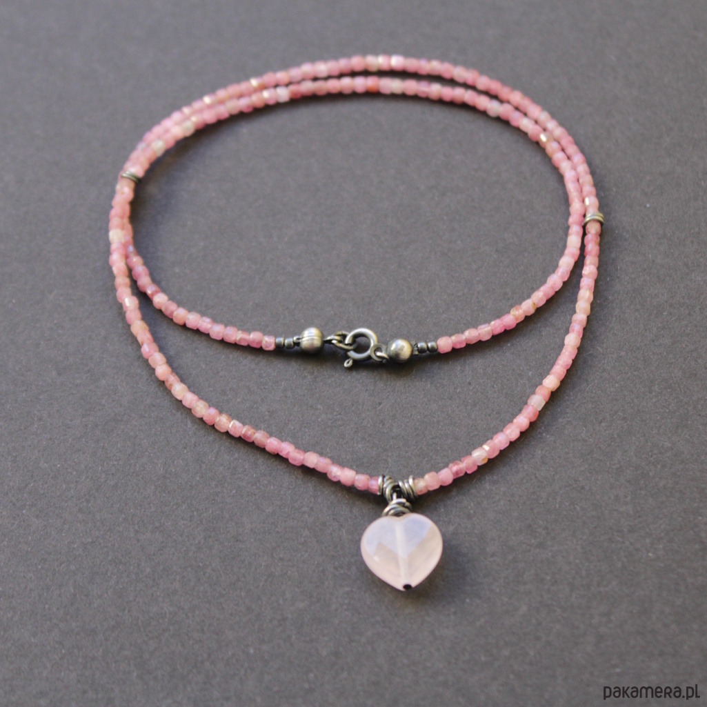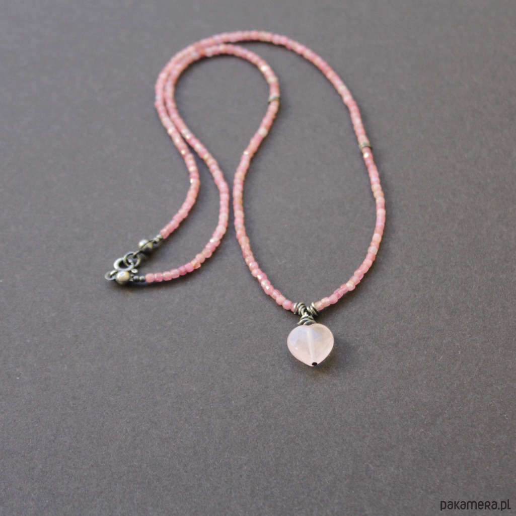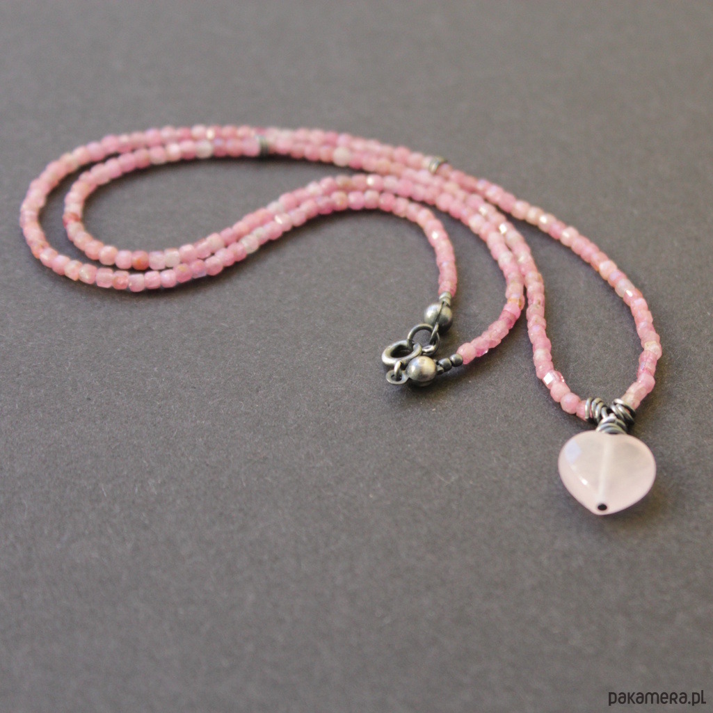 Naszyjnik ozdobiony został fasetowanym sercem z kwarcu różowego o wielkości 1 cm.