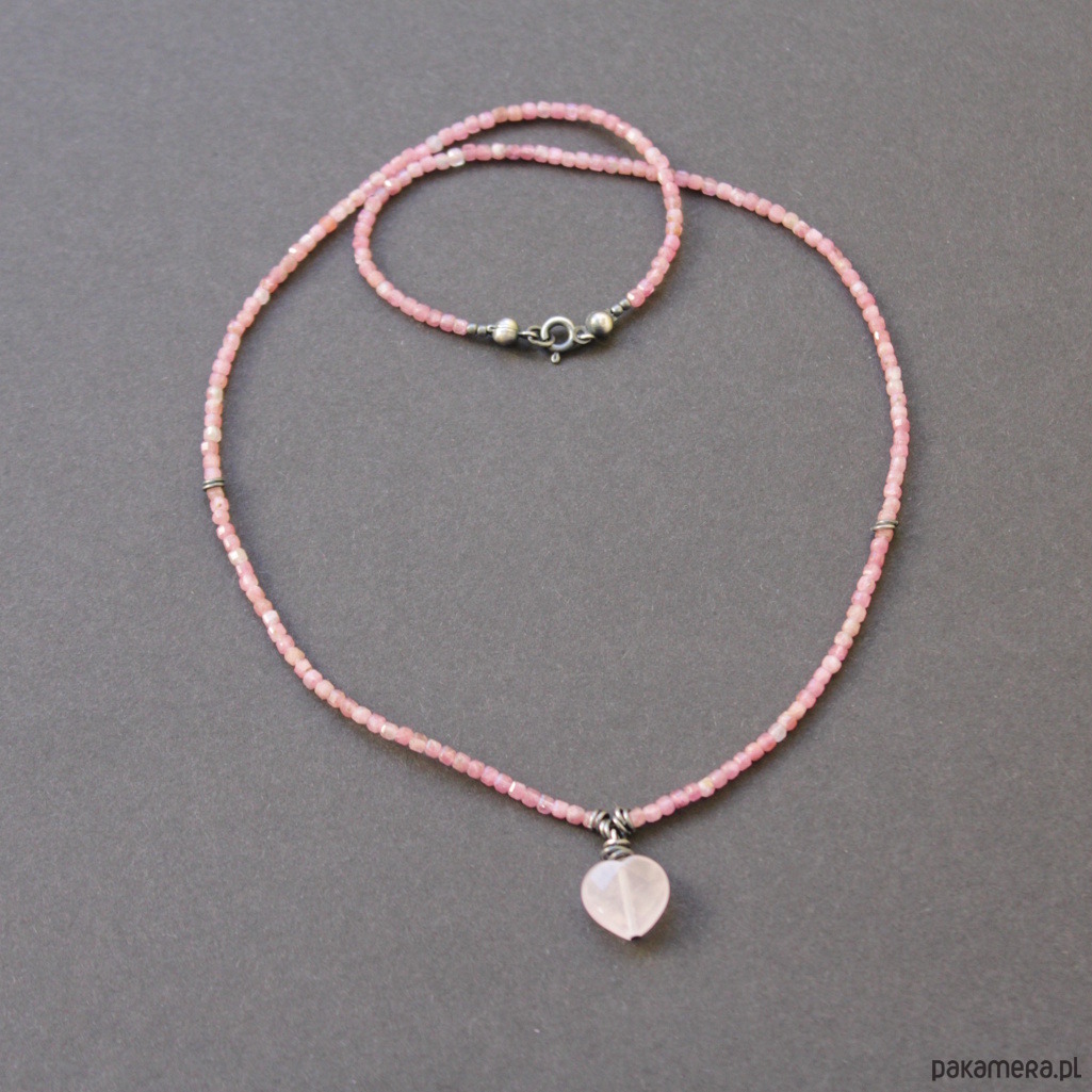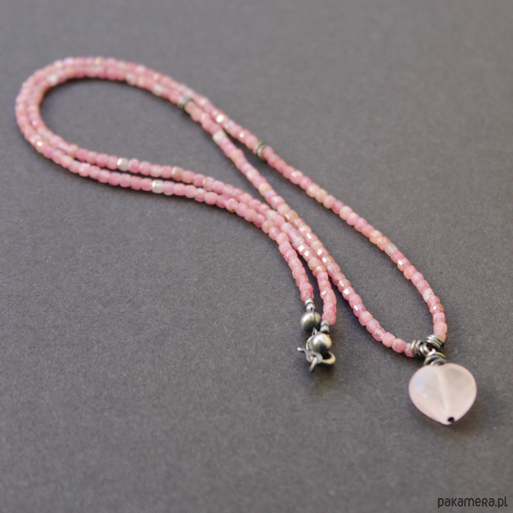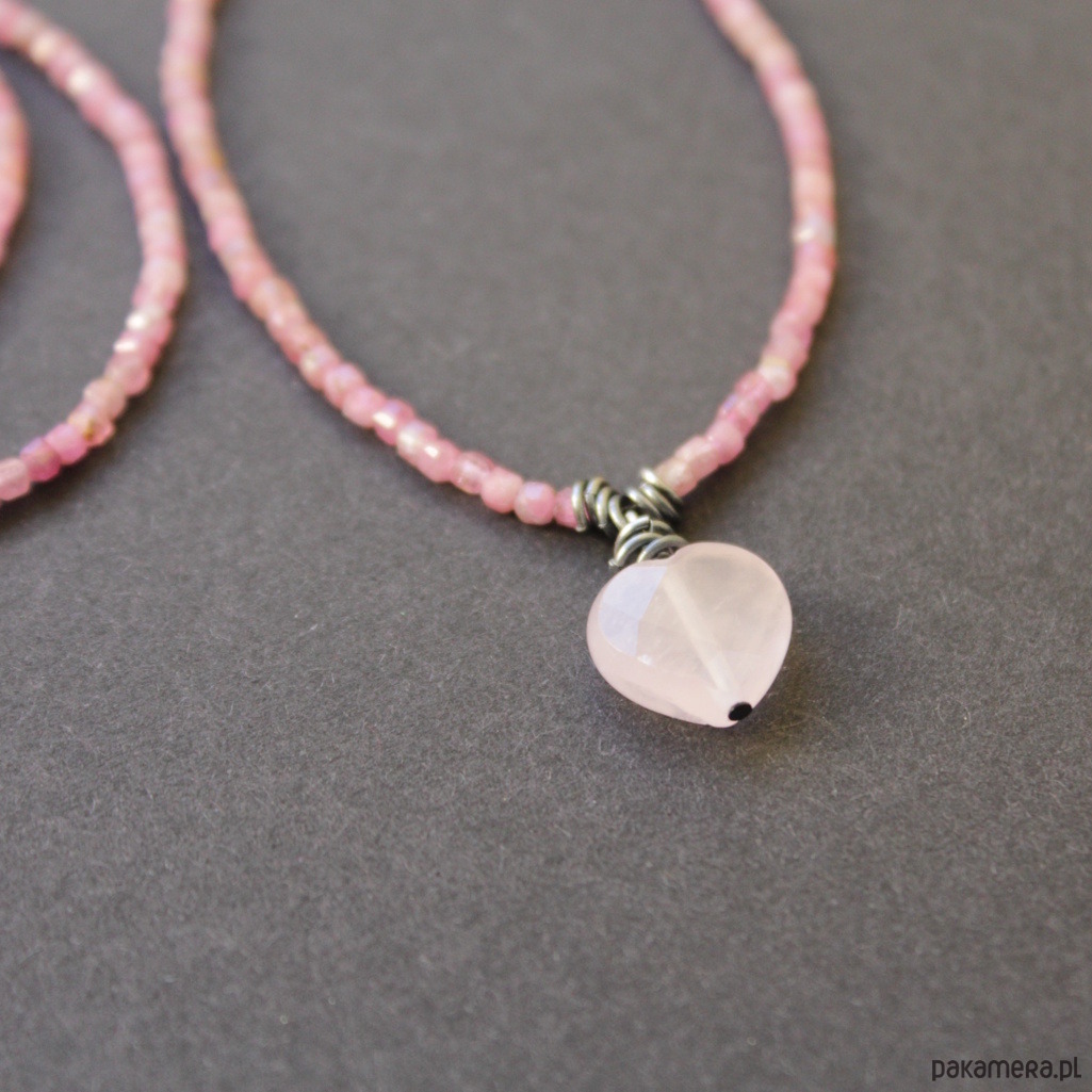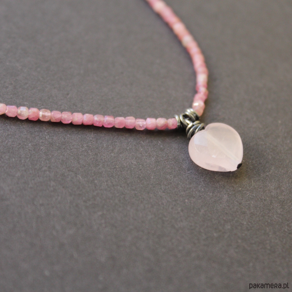 Naszyjnik ozdobiony został fasetowanym sercem z kwarcu różowego o wielkości 1 cm.