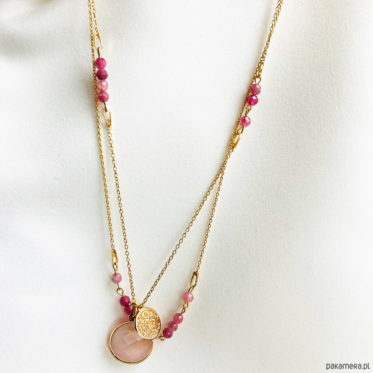 Wyjątkowo piękny delikatny naszyjnik skomponowany z dwóch łańcuszków z naturalnymi ręcznie dobranymi Turmalinami oraz zawieszki z oprawionym kwarcem różowym i monetką. Do kompletu polecam szeroki łańcuszek oferowany oddzielnie.