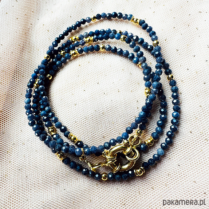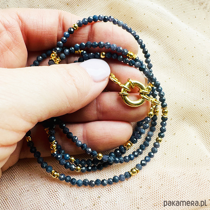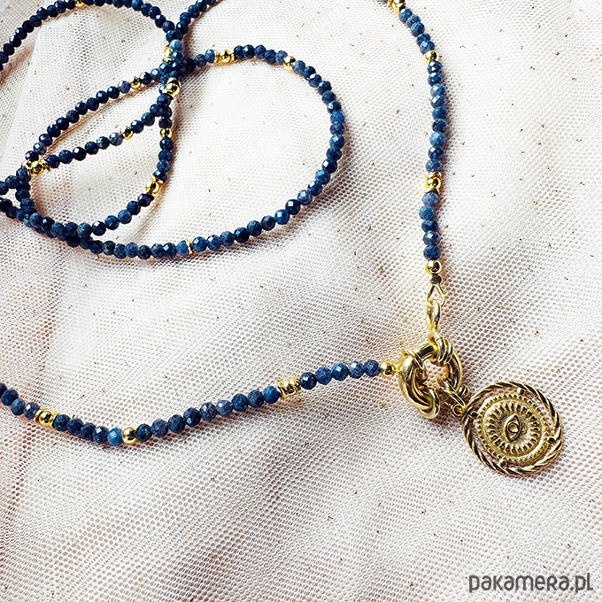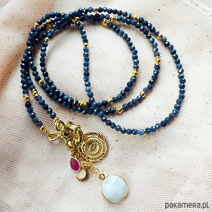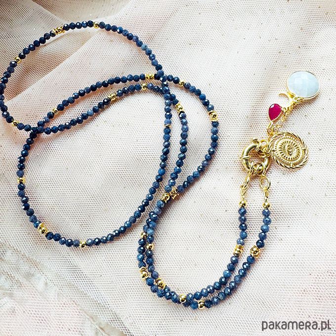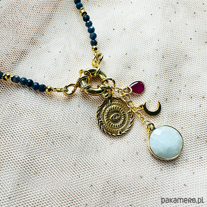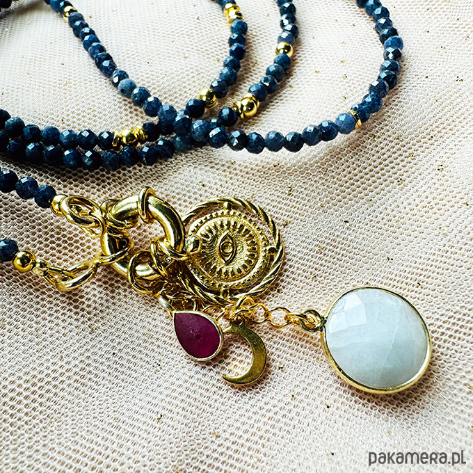 Wykonany ręcznie z naturalnych kamieni - fasetowanych szafirów z zawieszkami , które można zgodnie z nastrojem i okazją zdejmować lub zakładać - geometryczne oko, delikatny księżyc, rubin i kamień w oprawie: kamień księżycowy . Srebrne złocone 24 k złotem koraliki i elementy.