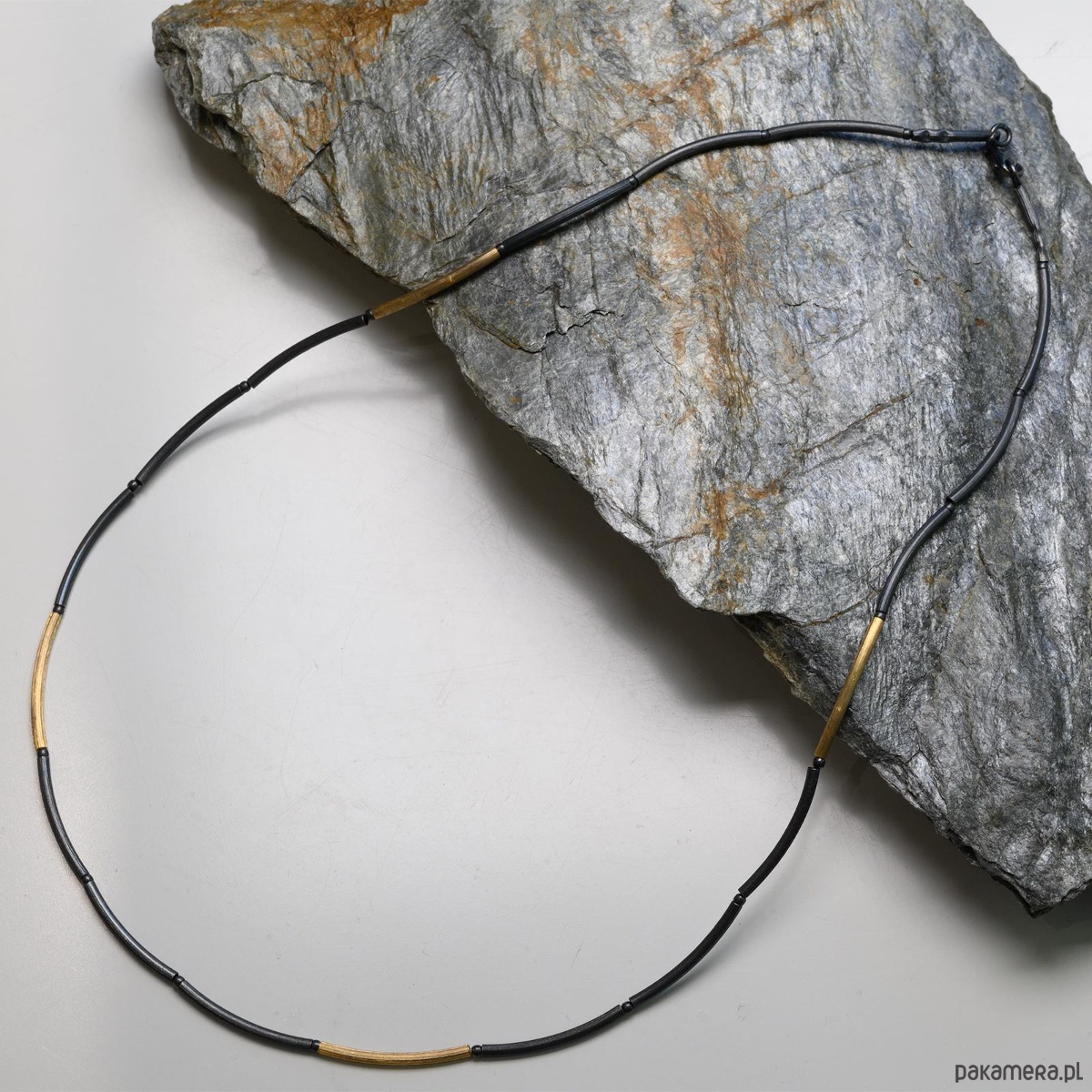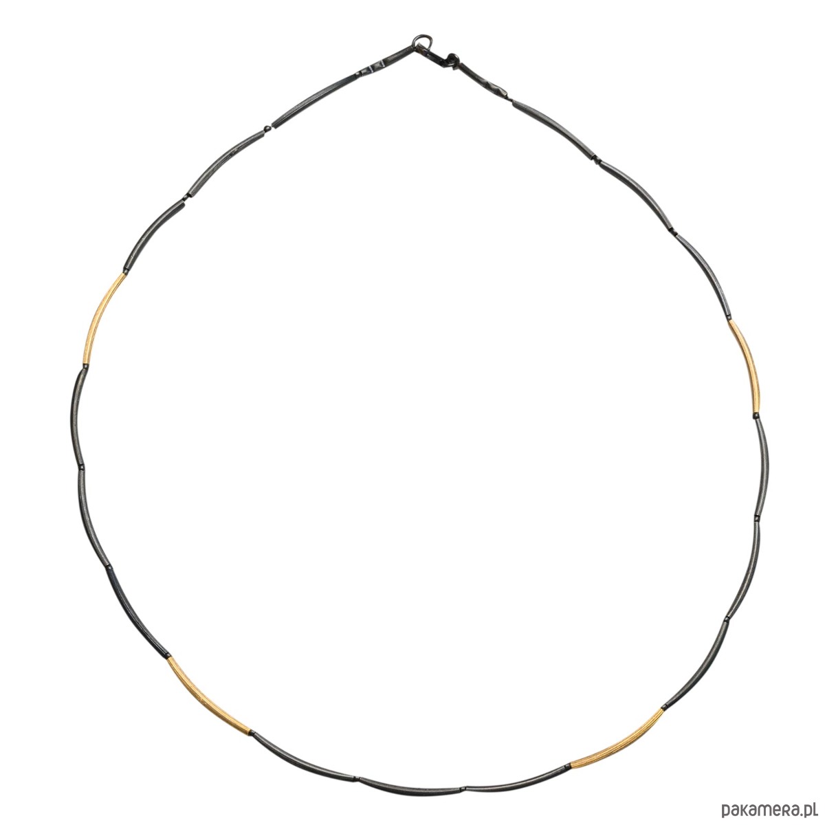 Przepiękny, oryginalny naszyjnik wykonany ze srebra, z czarnymi i złotymi rureczki. Wykonany z lekko ruchomych z elementów.