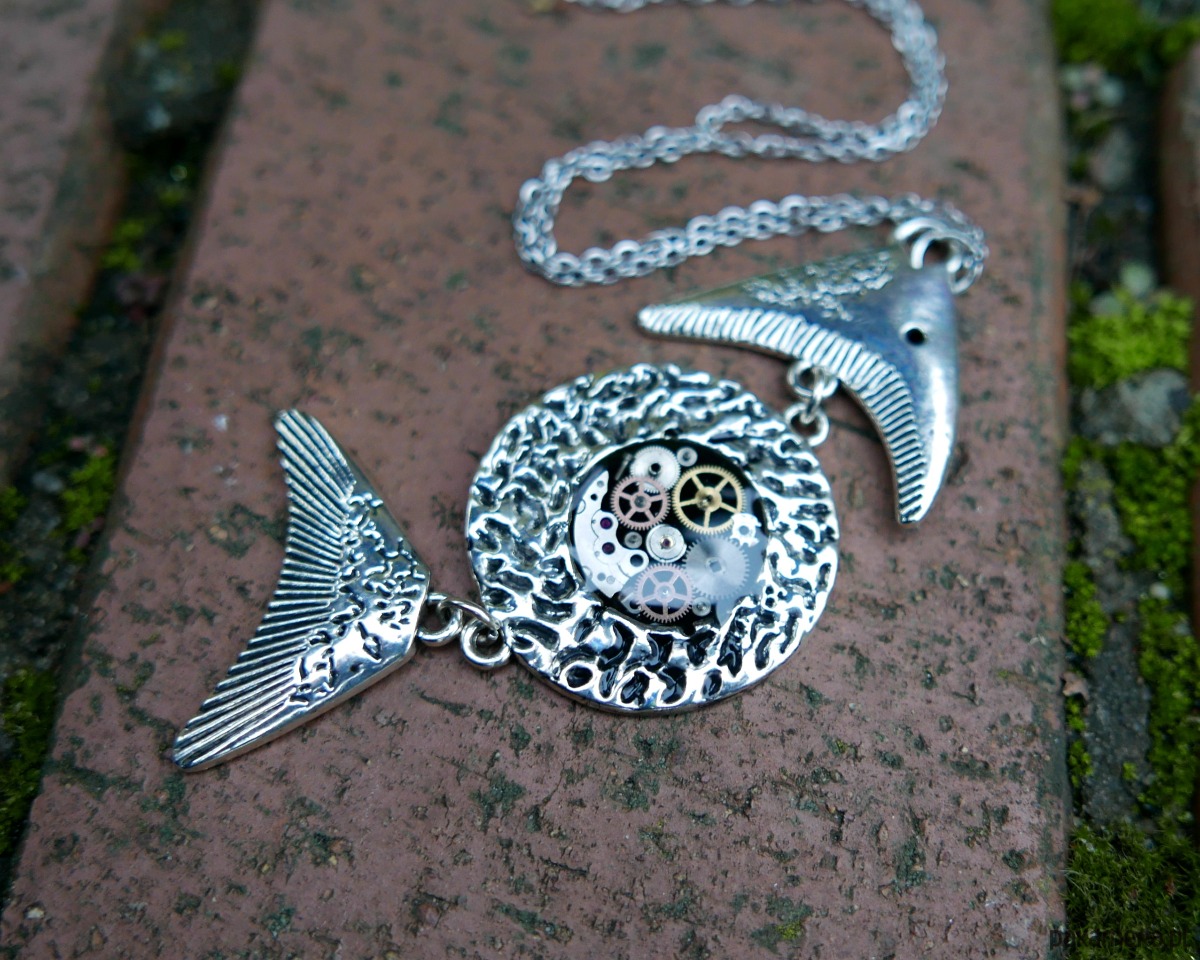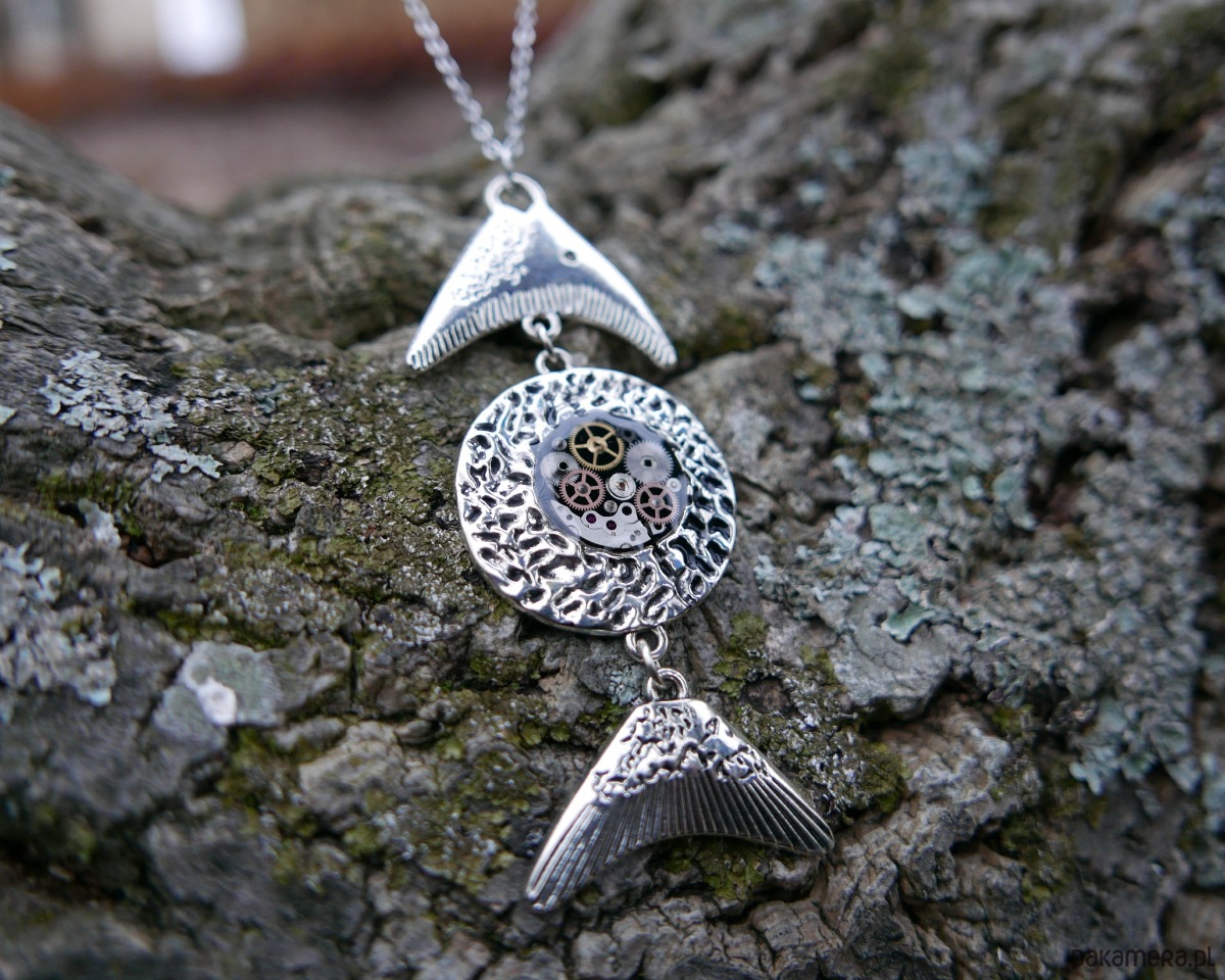 Okazały, ręcznie wykonany naszyjnik w stylu steampunk. W metalowej zawieszce zamknięto kompozycję z oryginalnych części mechanizmu zegarka i żywicy epoksydowej.