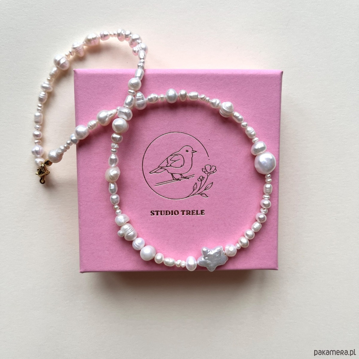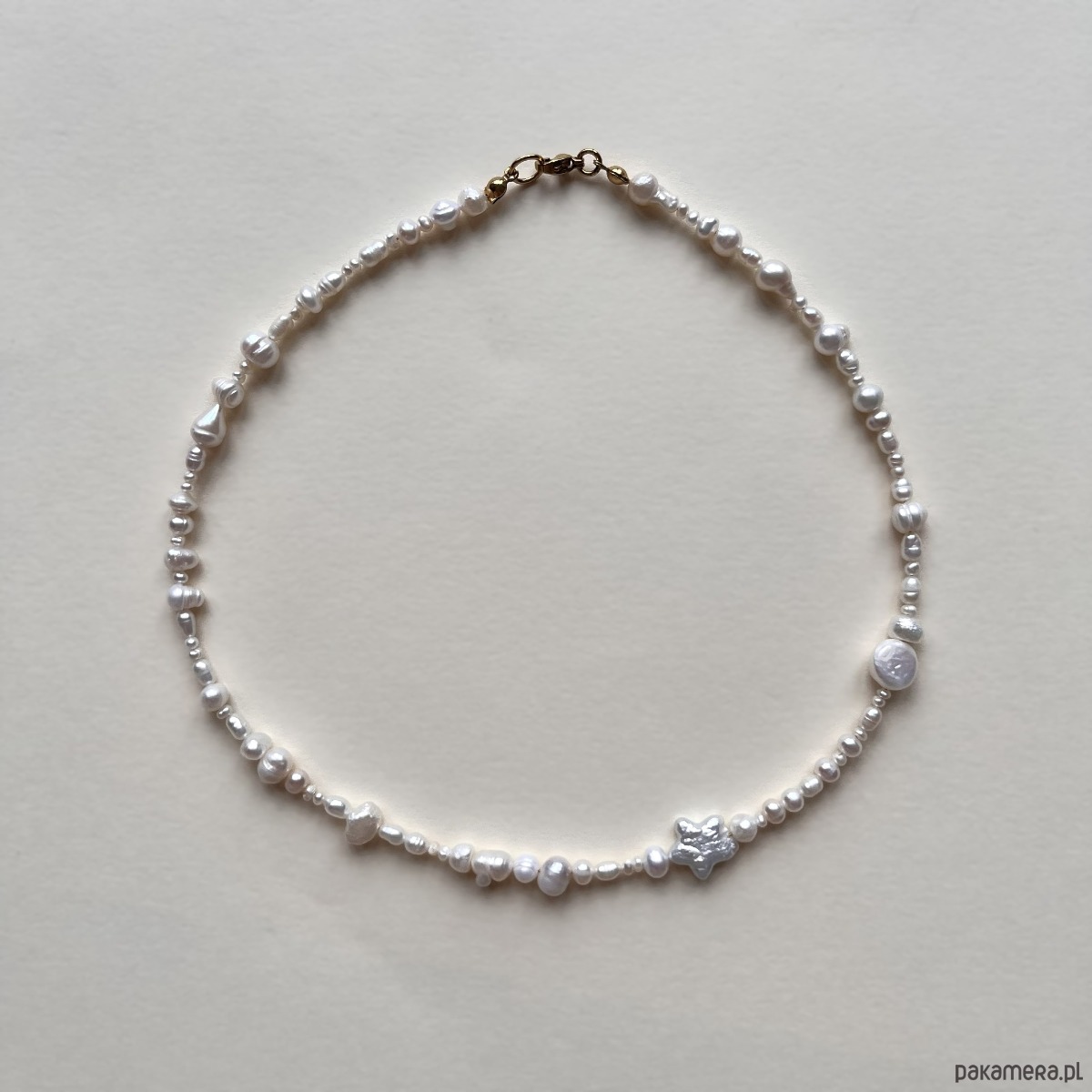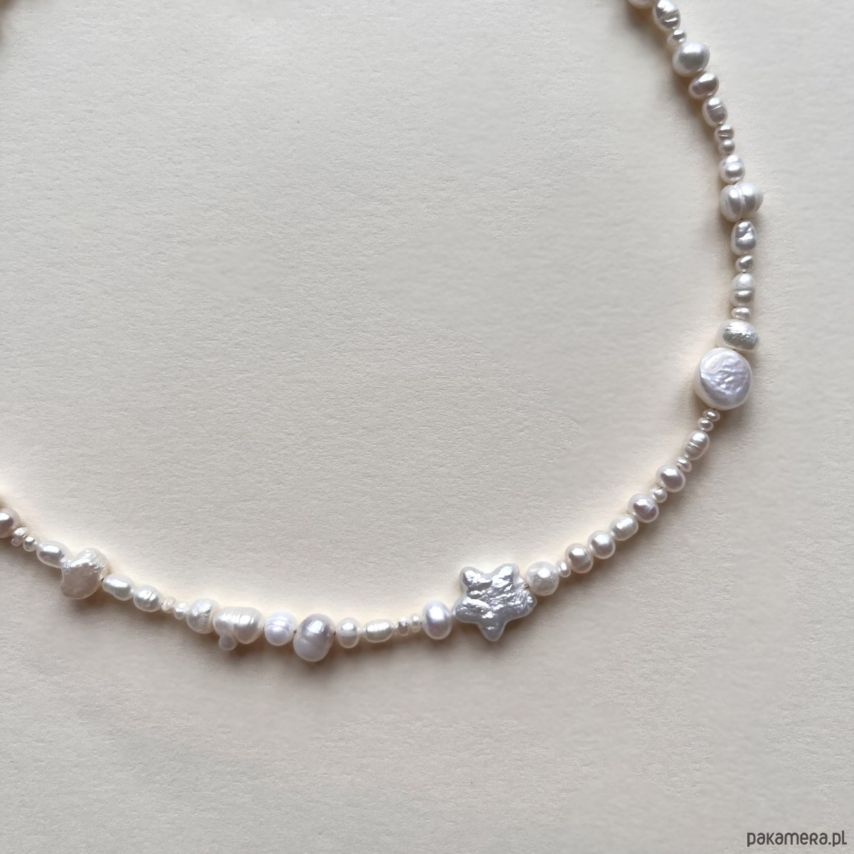 Nieregularne perły zestawione z perłową gwiazdką tworzą subtelny, morski akcent. Delikatny połysk i organiczna forma nadają mu lekko romantyczny charakter. Idealny na lato – i nie tylko.