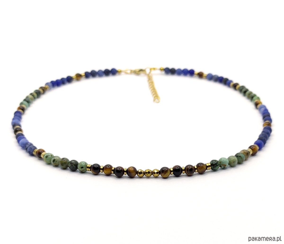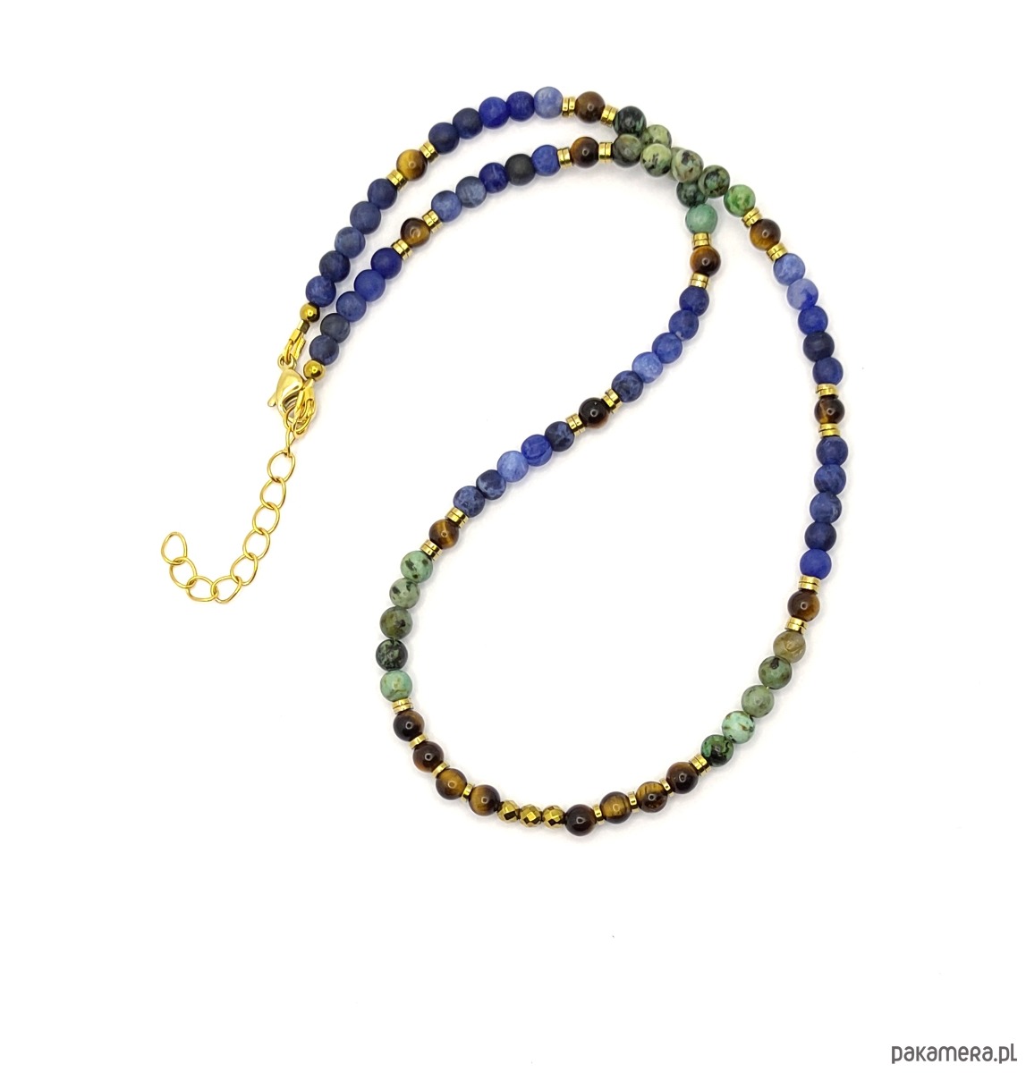 Naszyjnik wykonany z kamieni naturalnych: turkusu afrykańskiego, sodalitu oraz tygrysiego oka. Kojarzy mi się ze spokojnym dniem na sawannie, kiedy można obserwować piękne błękitne niebo nad ziemią i trawami. Wykończenie ze złoconej stali chirurgicznej.