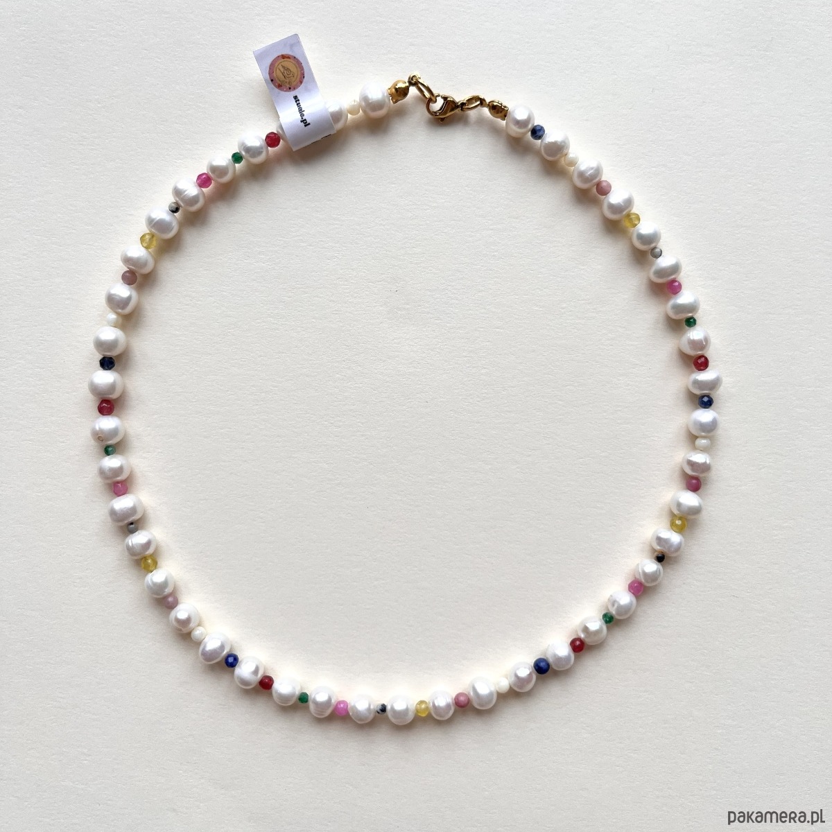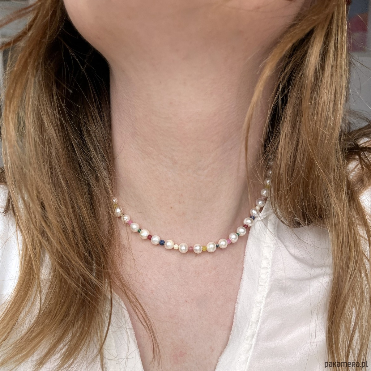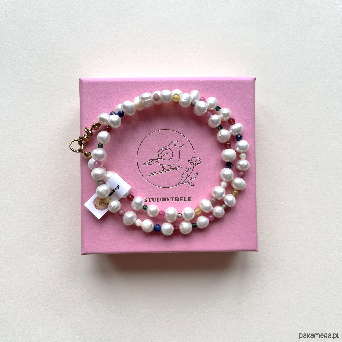 Perły przełamane drobnymi, kolorowymi kamieniami. Delikatny, ale pełen życia – jak letnie światło odbijające się od wody. Świetny do prostych stylizacji, którym chcesz dodać energii.