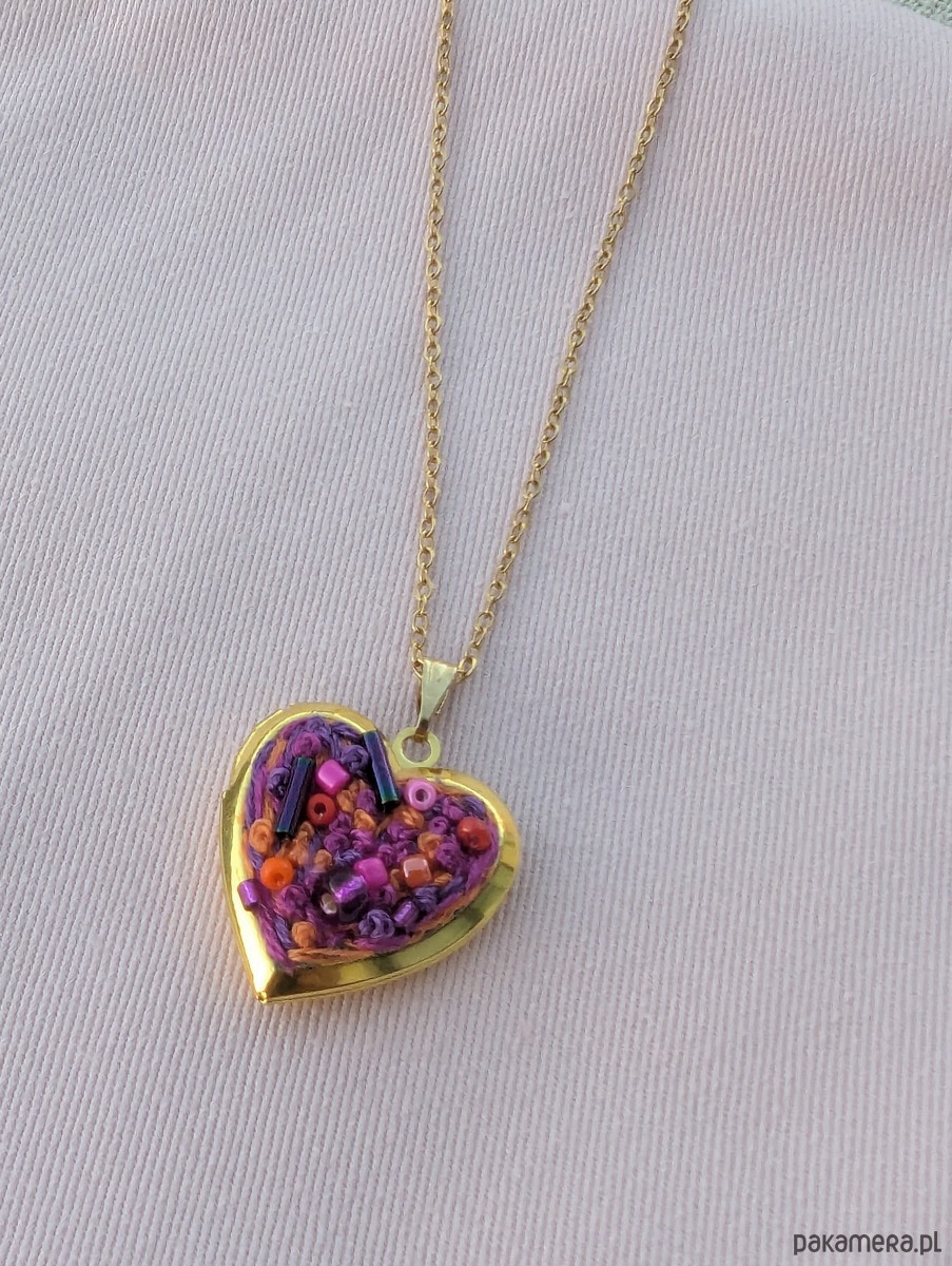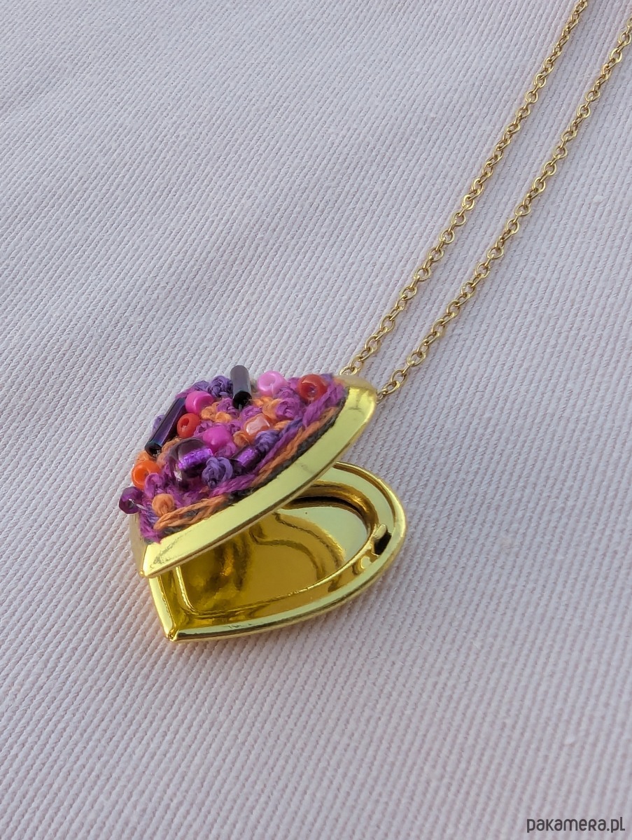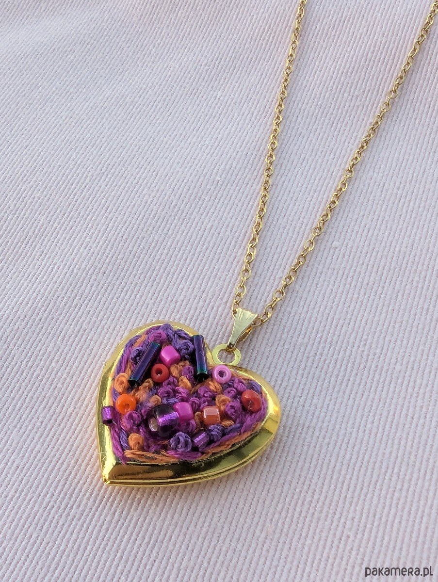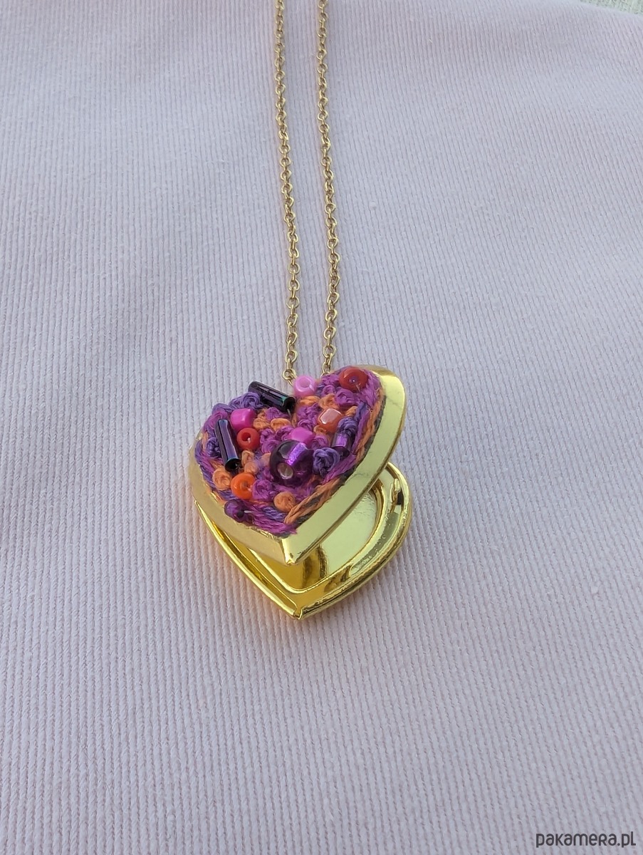 Ten uroczy sekretnik w kształcie serduszka został ozdobiony ręcznie wykonanym haftem w energetycznych kolorach fioletu, różu i pomarańczu. Delikatne szklane koraliki dodają mu subtelnego blasku oraz pięknej, trójwymiarowej faktury.