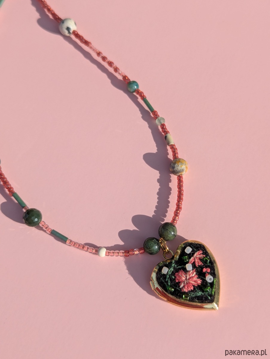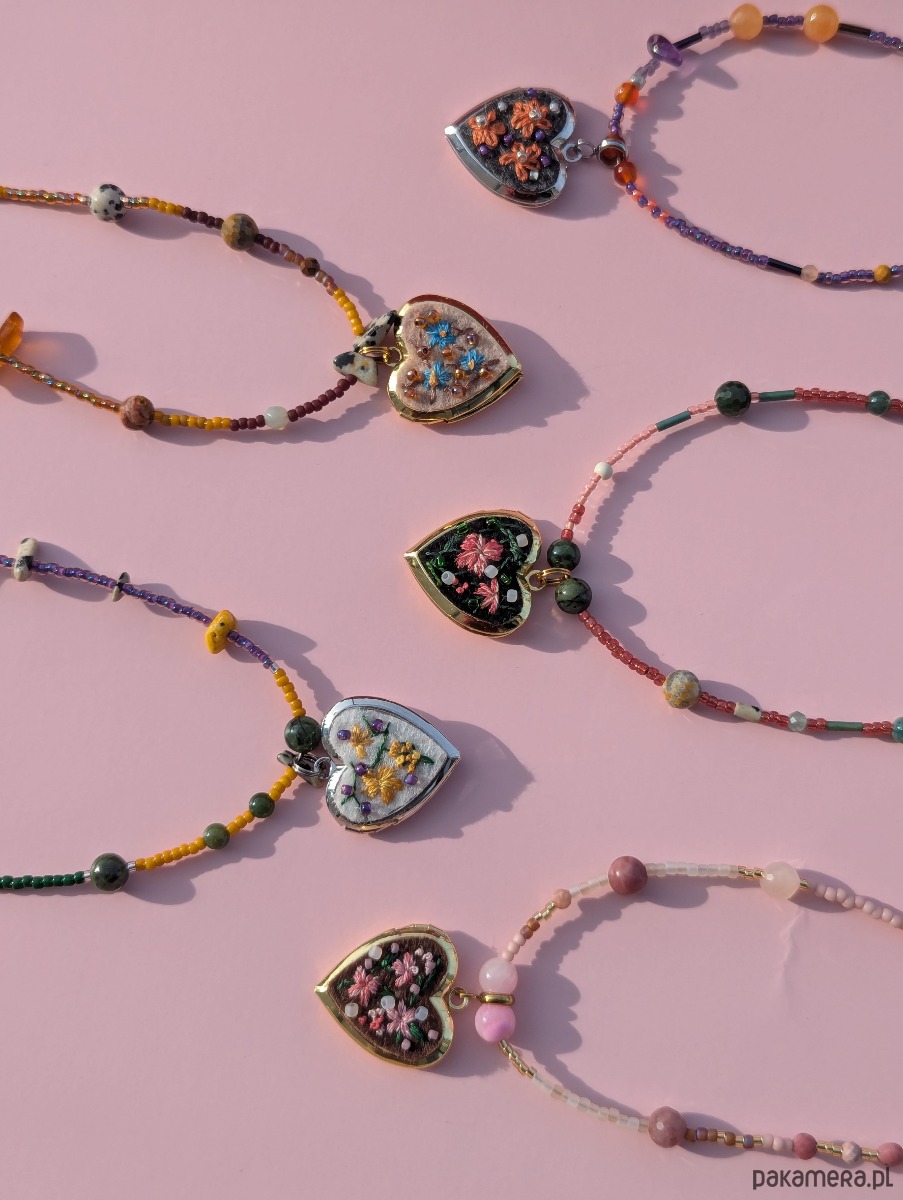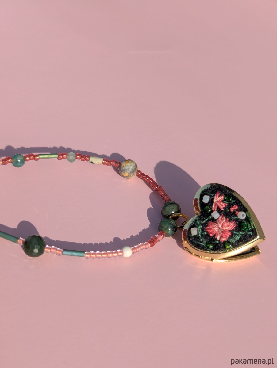 Specjalizuję się w hafcie ręcznym i to właśnie on jest sercem mojej twórczości. Tym razem postanowiłam połączyć moją miłość do haftu z fascynacją koralikami oraz kamieniami naturalnymi. Ręcznie wyhaftowane kwiaty na serduszku-sekretniku spotykają się tu z intuicyjnie nawlekanymi kamieniami i szklanymi koralikami