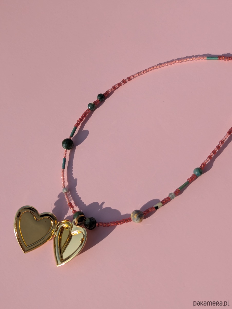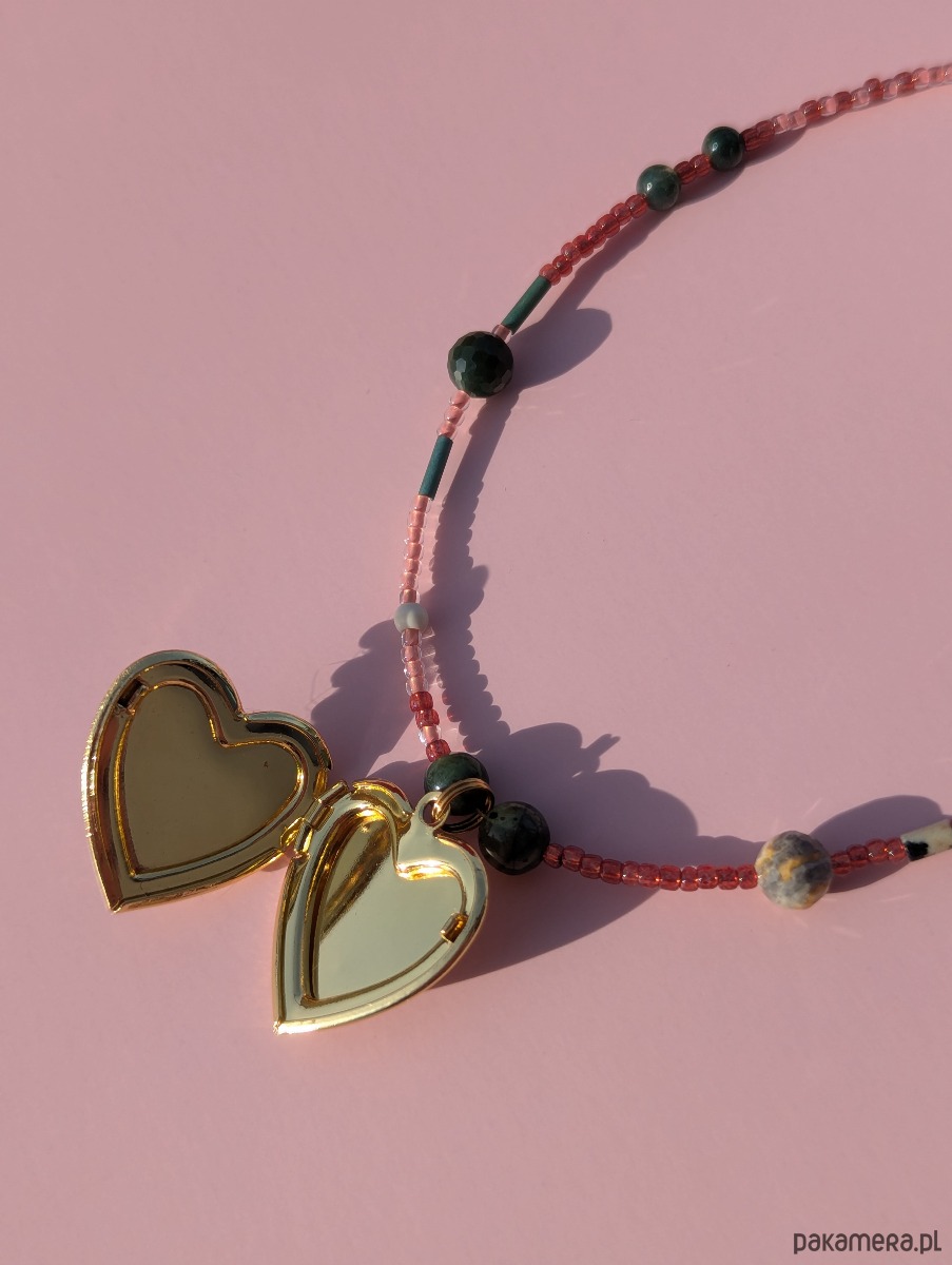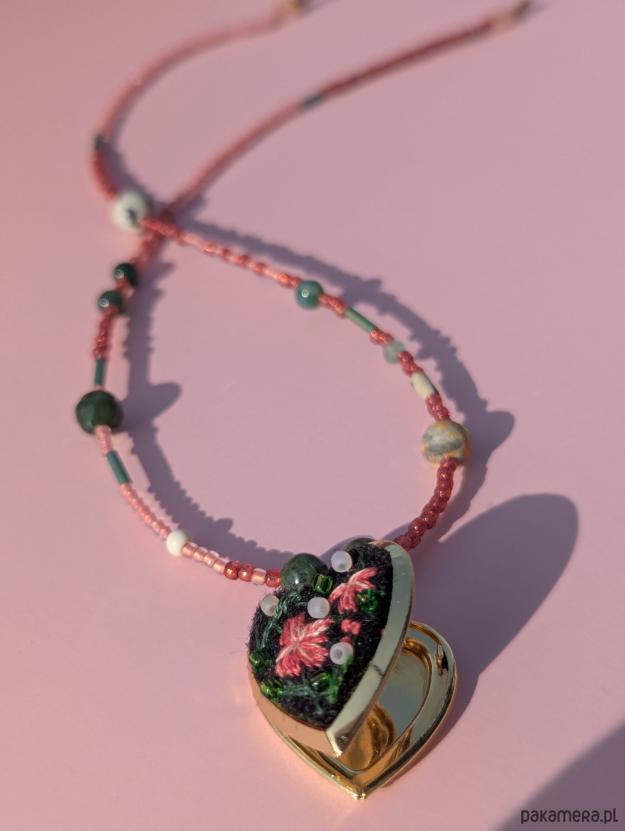 Specjalizuję się w hafcie ręcznym i to właśnie on jest sercem mojej twórczości. Tym razem postanowiłam połączyć moją miłość do haftu z fascynacją koralikami oraz kamieniami naturalnymi. Ręcznie wyhaftowane kwiaty na serduszku-sekretniku spotykają się tu z intuicyjnie nawlekanymi kamieniami i szklanymi koralikami