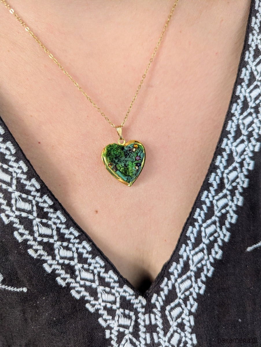Ten sekretnik w kształcie serca kryje w sobie fragment lasu – wyhaftowany ręcznie motyw traw, liści i mchu. Dodałam też połyskujące koraliki, które odbijają światło jak krople rosy na porannych liściach czy migoczące w cieniu promienie słońca przebijające się przez gałęzie.