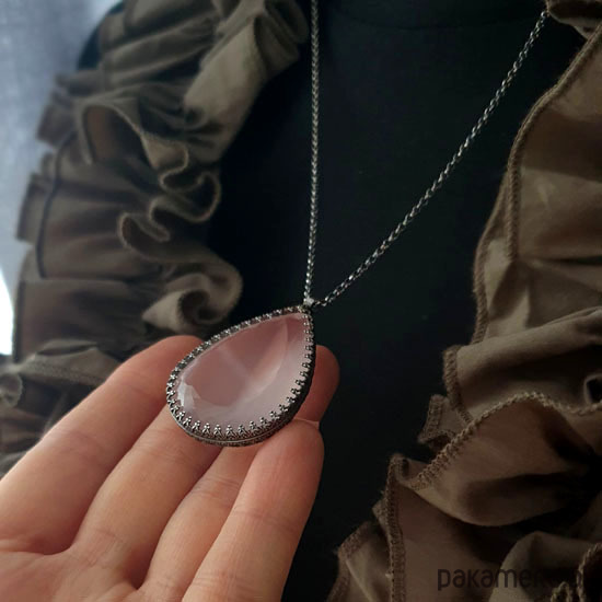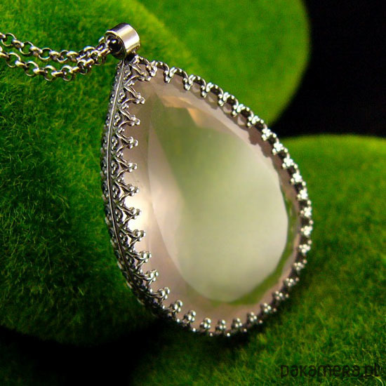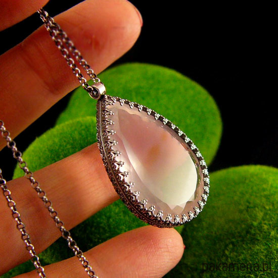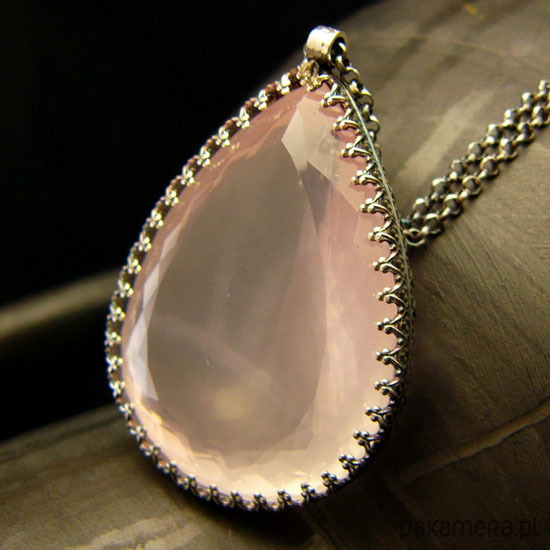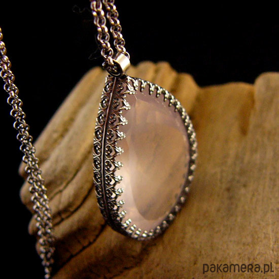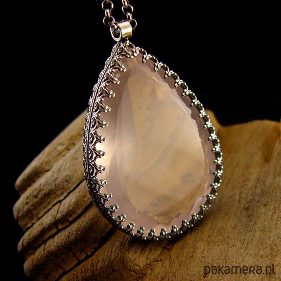 Naszyjnik którego sercem jest przepięknej urody różowy Kwarc o niesamowitym szlifie. Wisior jest dwustronny. Całość wykonana ręcznie na srebrze próby 925, oksydowana przetarta i wypolerowana na wysoki połysk. Długość całkowita wisiora 4 cm, szerokość 2,8 cm. Łańcuszek o długości 70 cm w tym 5 cm regulacji. Kwarc różowy jest kamieniem serca i miłości. Kryształ emanuje czystą bezwarunkową miłością. Jest to kompas dla serca. Zdjęcie wykonane na manekinie o rzeczywistych ludzkich rozmiarach Jest to unikat.