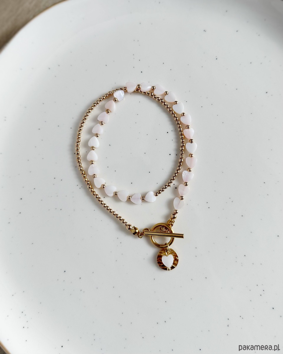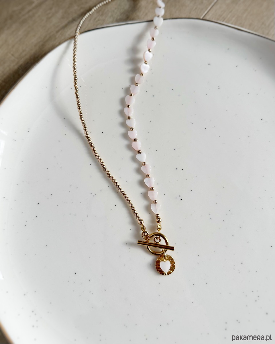 Naszyjnik z różowych serduszek z muszli i hematytem metalizowanym na złoto. Zawieszka z blaszką i serduszkiem 🩷