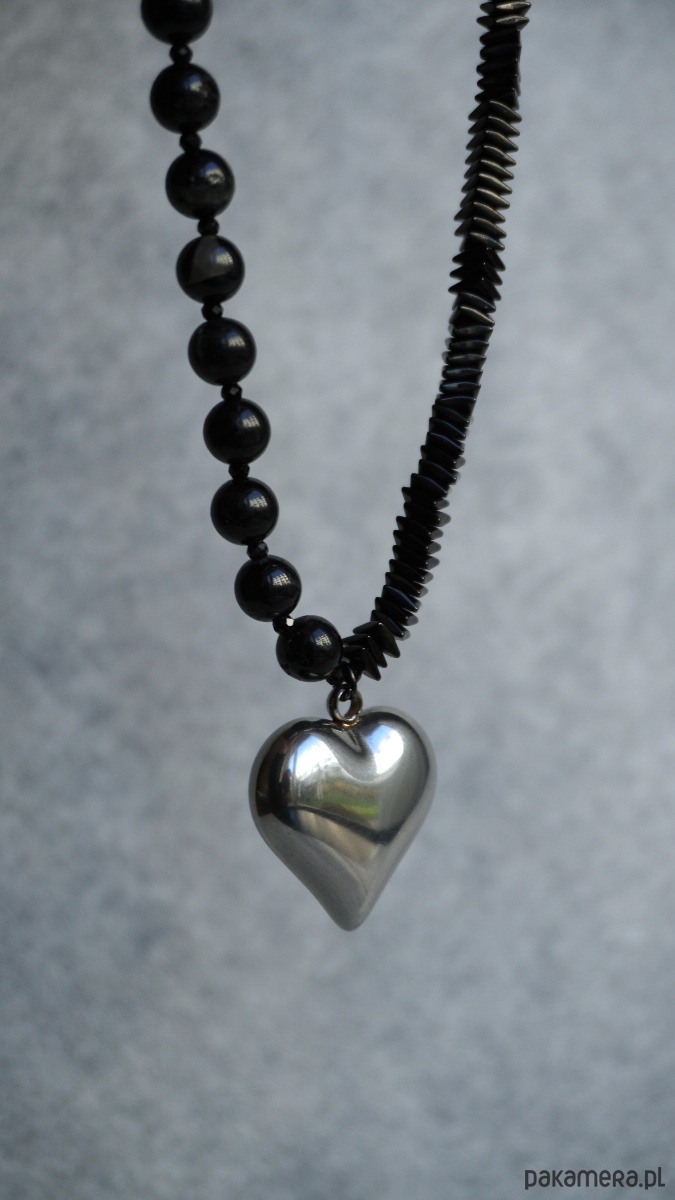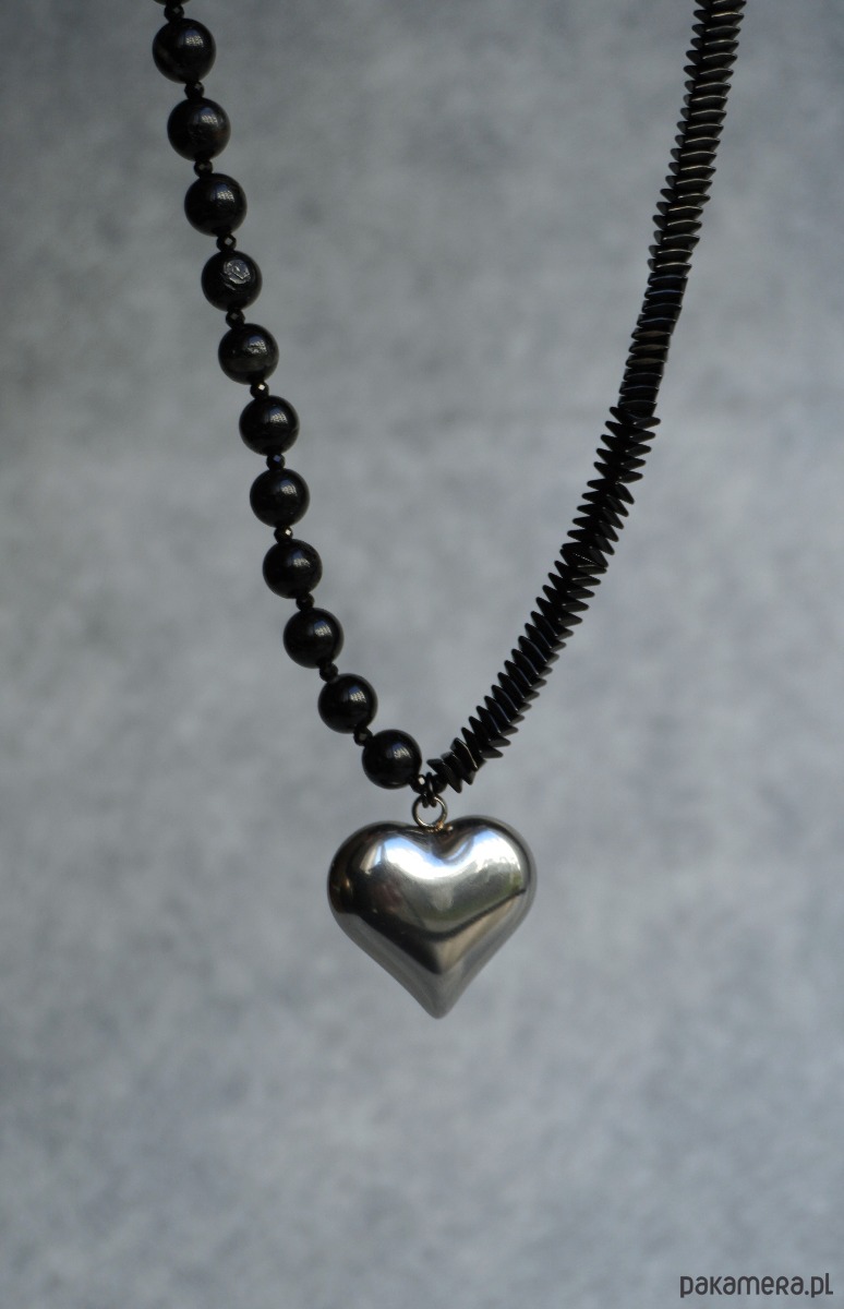 Stylowy naszyjnik wykonany z naturalnych koralików turmalinu i hematytu, ozdobiony metalową (stal szlachetna) zawieszką w kształcie serca. Turmalin nadaje biżuterii głębi i tajemniczego blasku, a hematyt dodaje subtelnego połysku i harmonii w kompozycji.