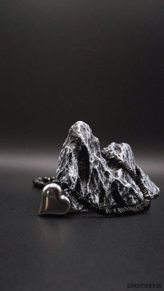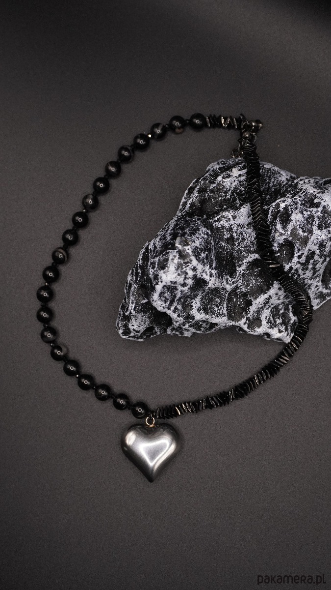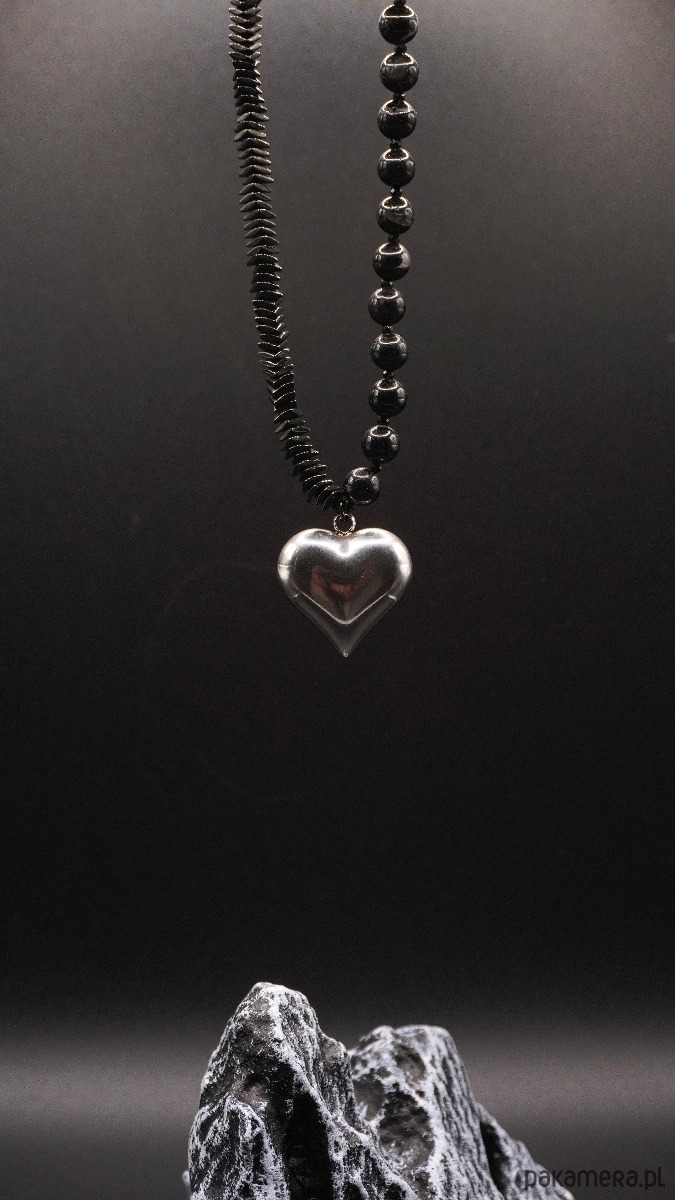 Stylowy naszyjnik wykonany z naturalnych koralików turmalinu i hematytu, ozdobiony metalową (stal szlachetna) zawieszką w kształcie serca. Turmalin nadaje biżuterii głębi i tajemniczego blasku, a hematyt dodaje subtelnego połysku i harmonii w kompozycji.