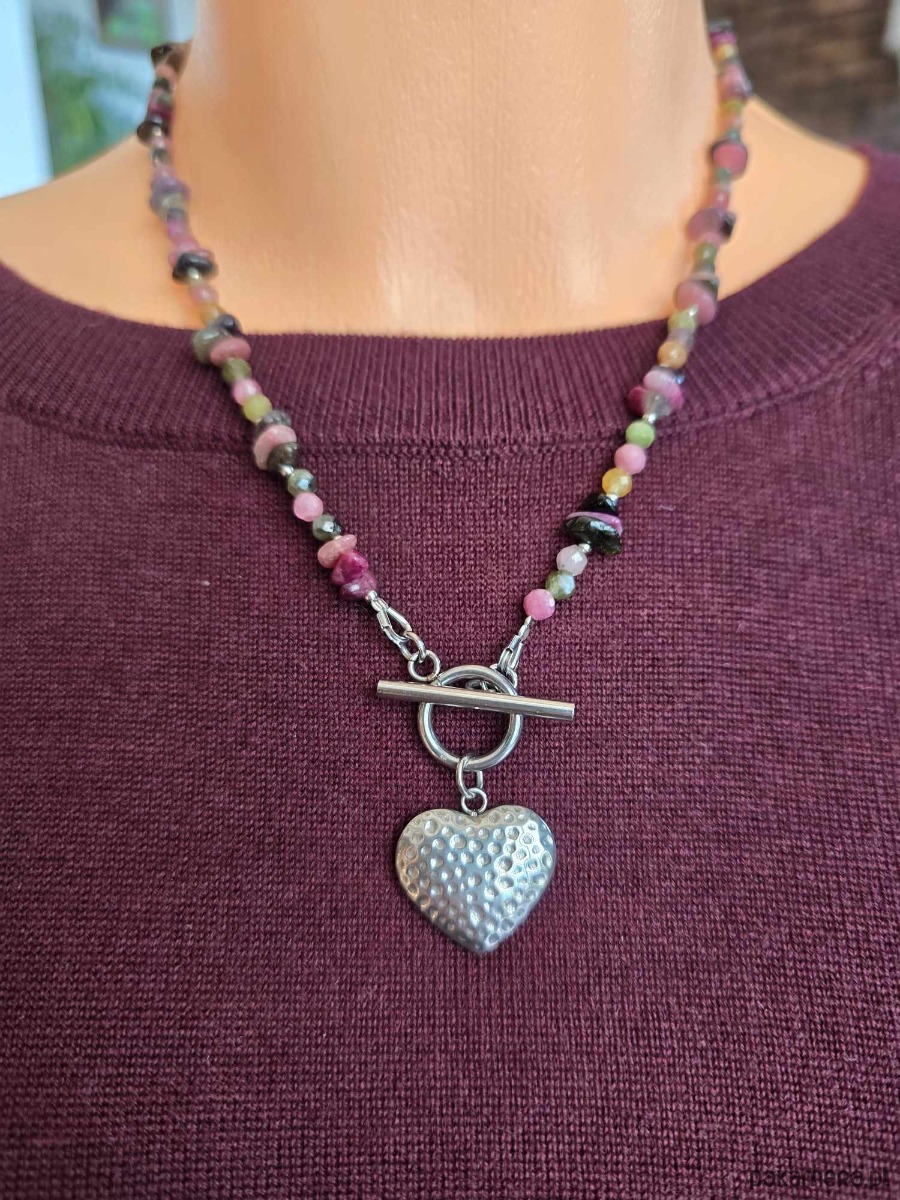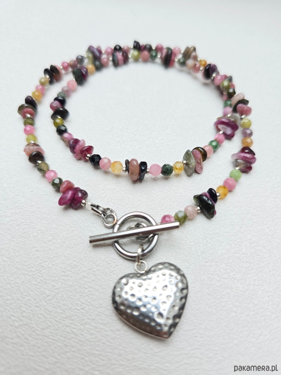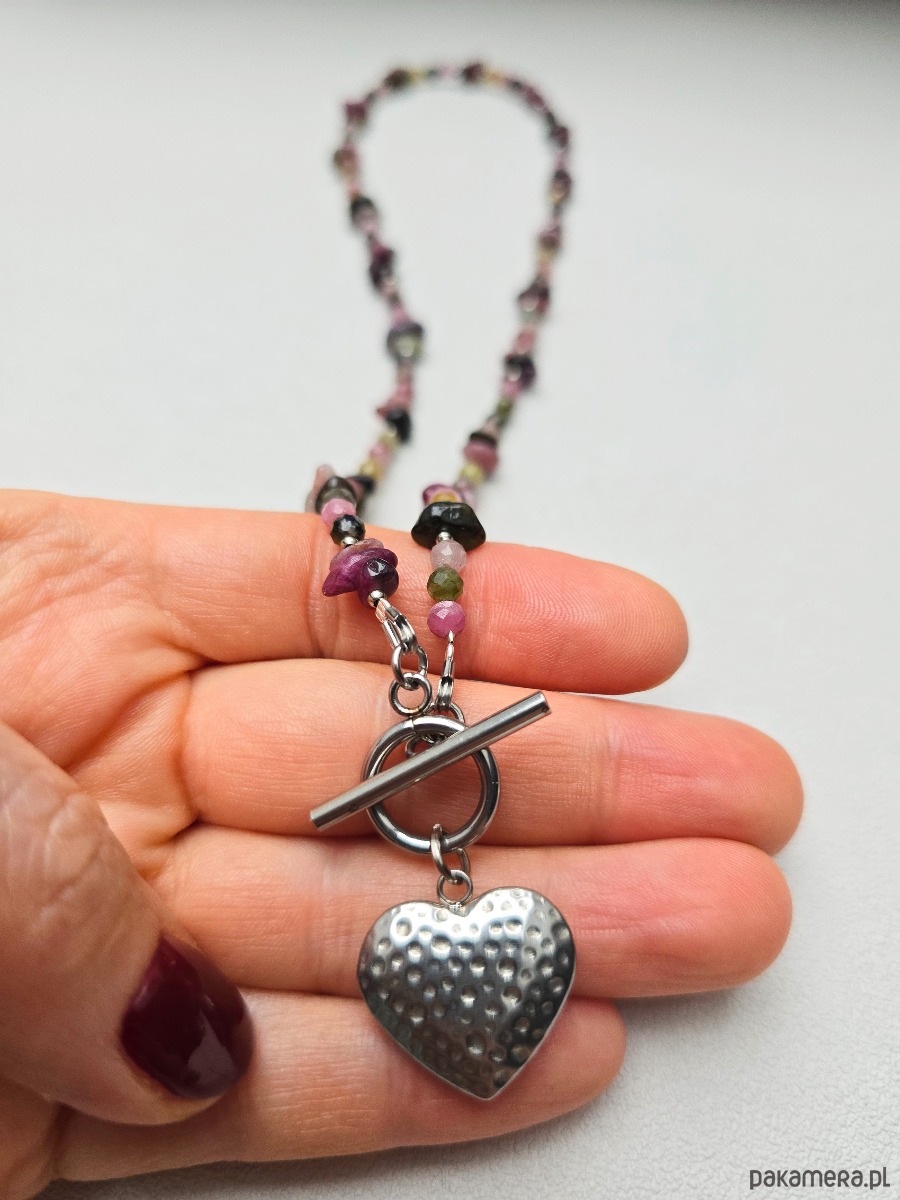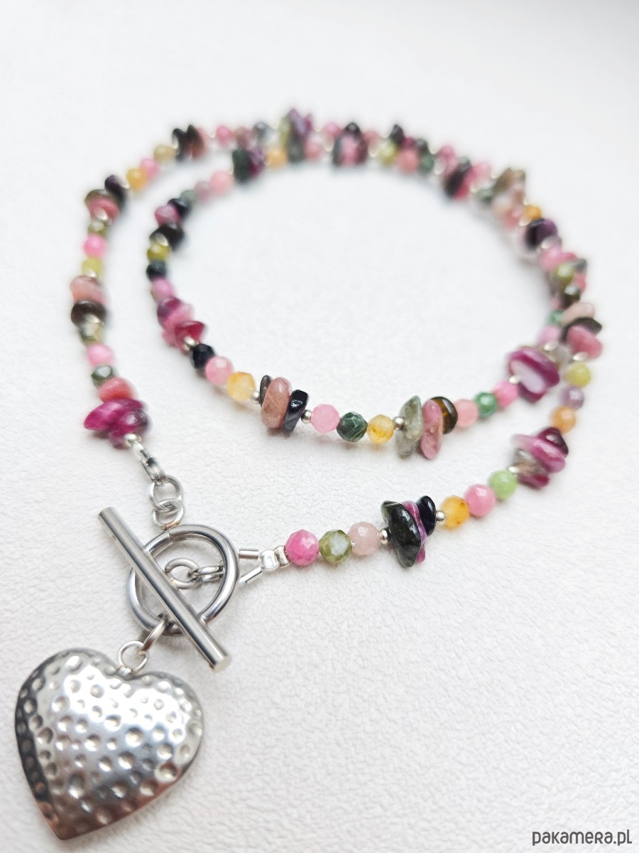 Naszyjnik z kolorowego turmalinu. Zapinany z przodu zapięciem toggle. Ozdobą naszyjnika jest młotkowana zawieszka w kształcie serca.