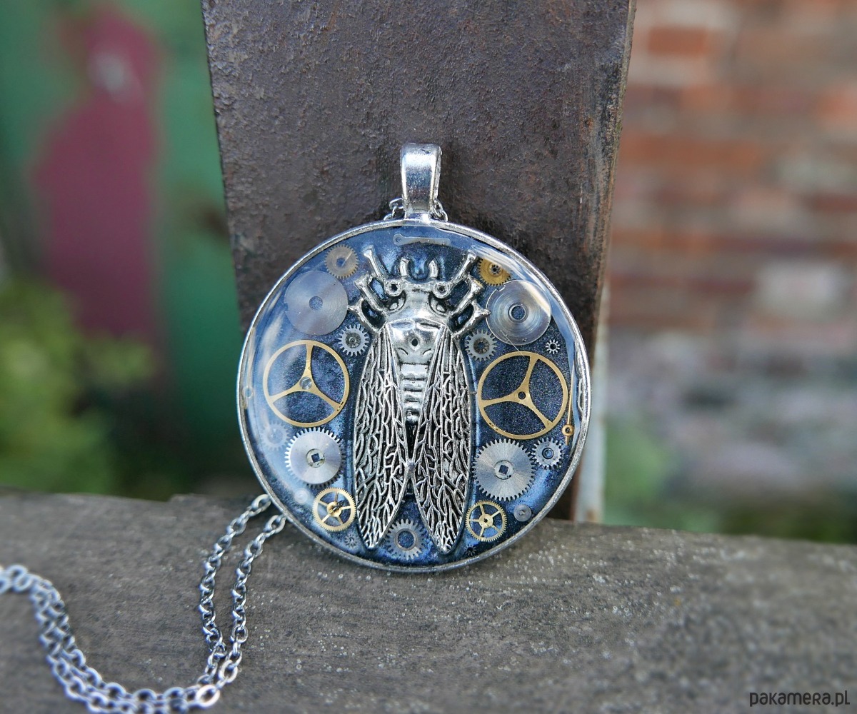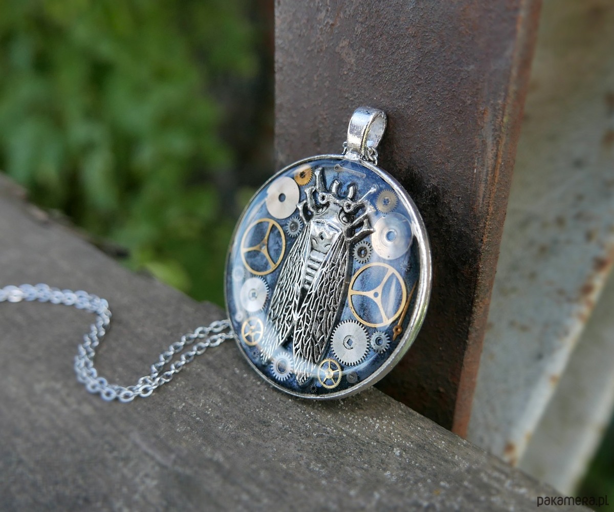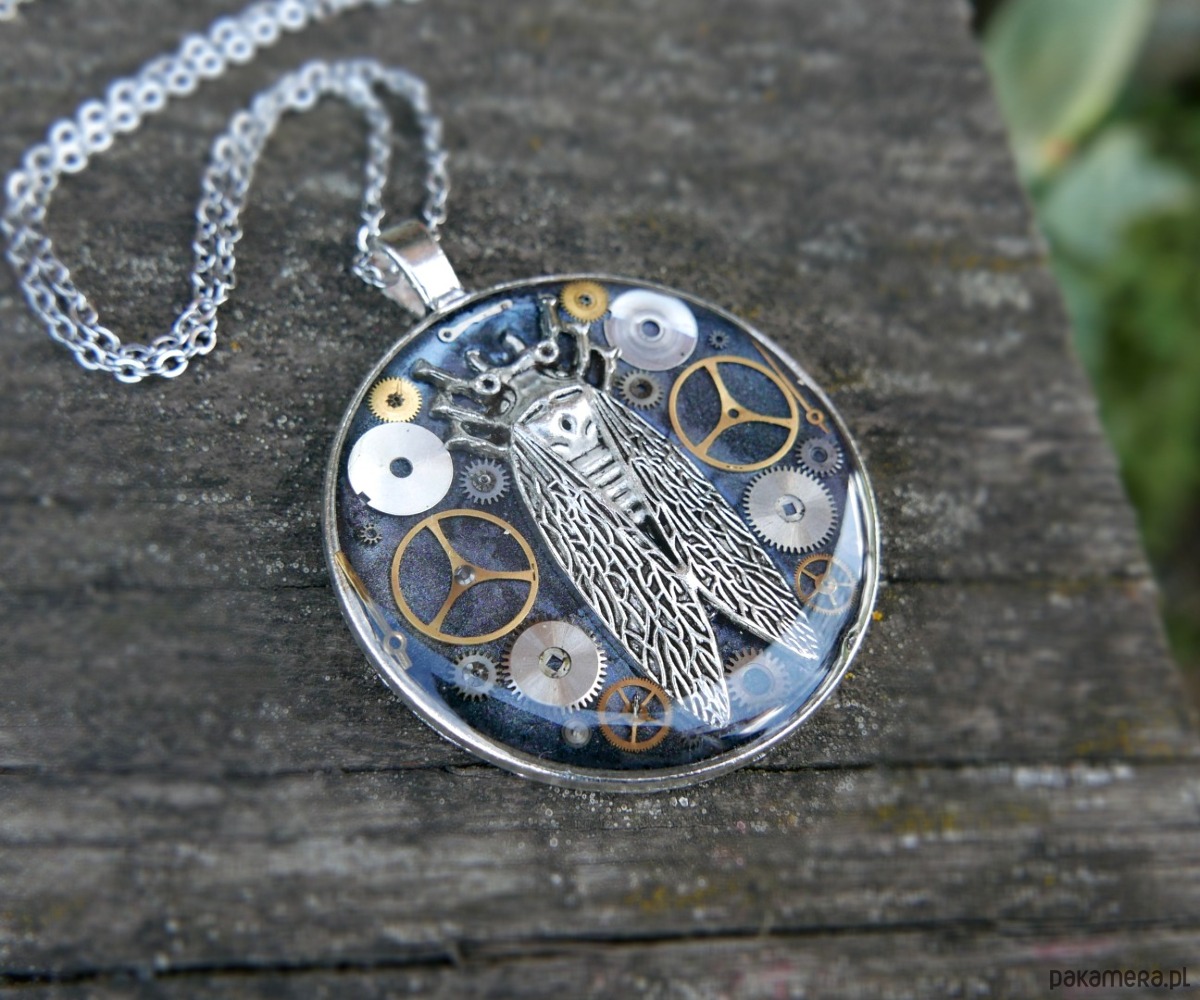 Wyjątkowy naszyjnik w stylu steampunk. W okrągłej zawieszce zamknięto kompozycję z oryginalnych części mechanizmu zegarka i metalowej cykady.