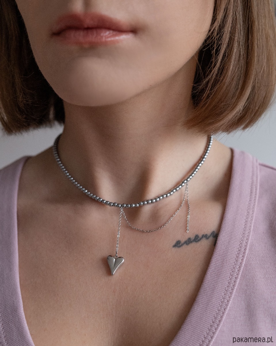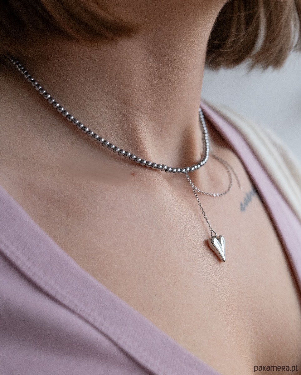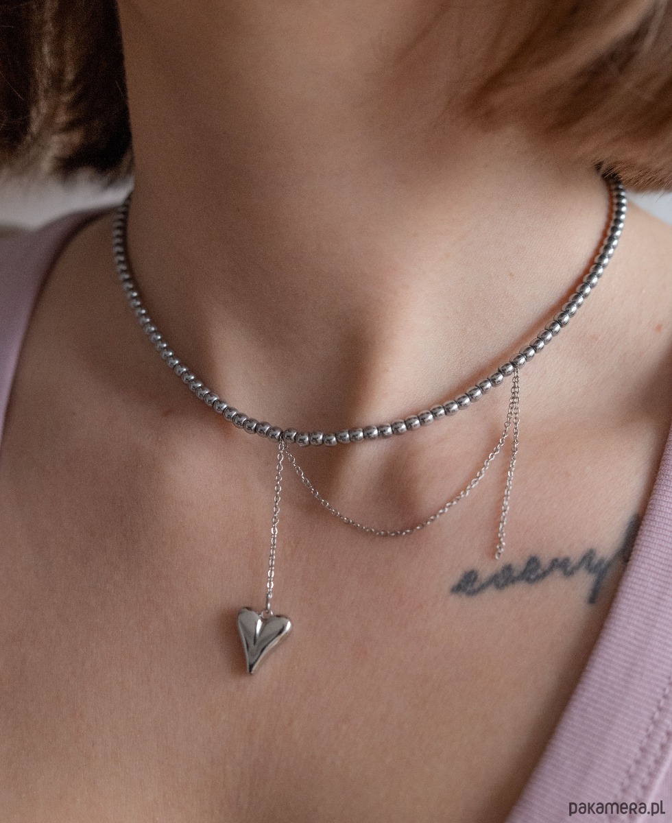 Wykonany z drobnych srebrnych hematytów, uzupełniony delikatnym łańcuszkiem zakończonym subtelnym sercem.